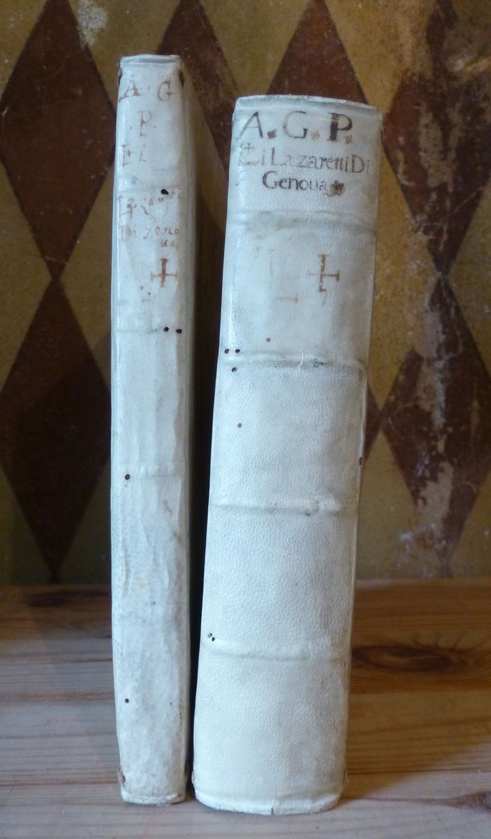 Genova,Calenzani,1658. In-8°. Pergamena del secolo XVIII. Margini un poco esigui ma buon esemplare. Si unisce nel lotto anche la seconda edizione di questo libro(Genova,Franchelli,1744),Legatura coeva in piena pergamena ma mancante del frontespizio.