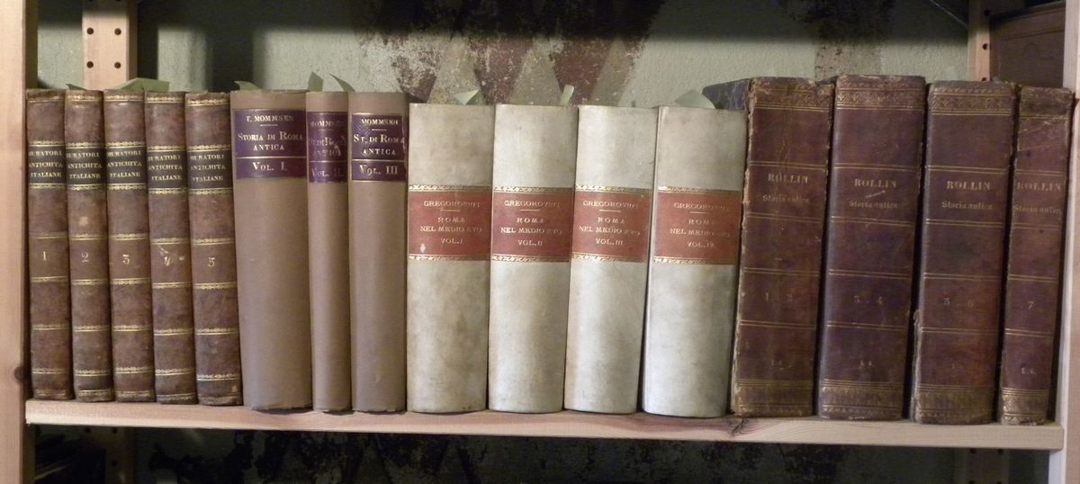 Sono compresi nel lotto:Dissertazioni sopra le antichità italiane di L.A.Muratori,Milano,Classici italiani,1836.cinque tomi./Storia di Roma antica di teodoro Mommsen.Roma-Torino,Roux e Viarengo,1903. Tre volumi./Storia della città di Roma nel medioevo di F.Gregorovius.Roma,Romagna e c.,1912.Quattro Volumi./Storia antica di Carlo Rollin.Genova,Olzati,1792.7 tomi in quattro volumi. Con carte geografiche in fine.