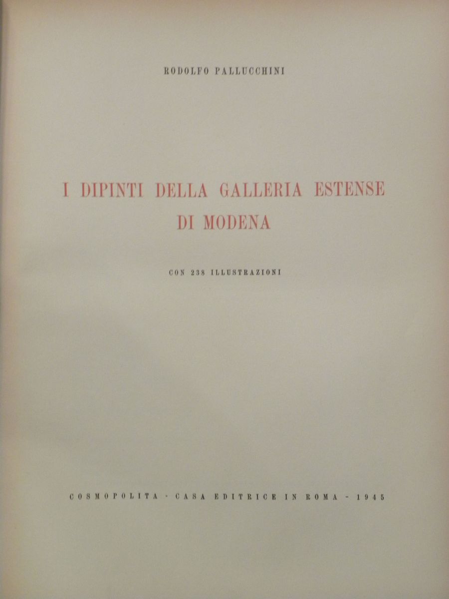 Lotto misto di volumi sull’Arte dell’Emilia Romagna (37 volumi tot.) tra cui: Rodolfo Pallucchini, I dipinti della Galleria Estense di Modena. Roma, Cosmolita, 1945.