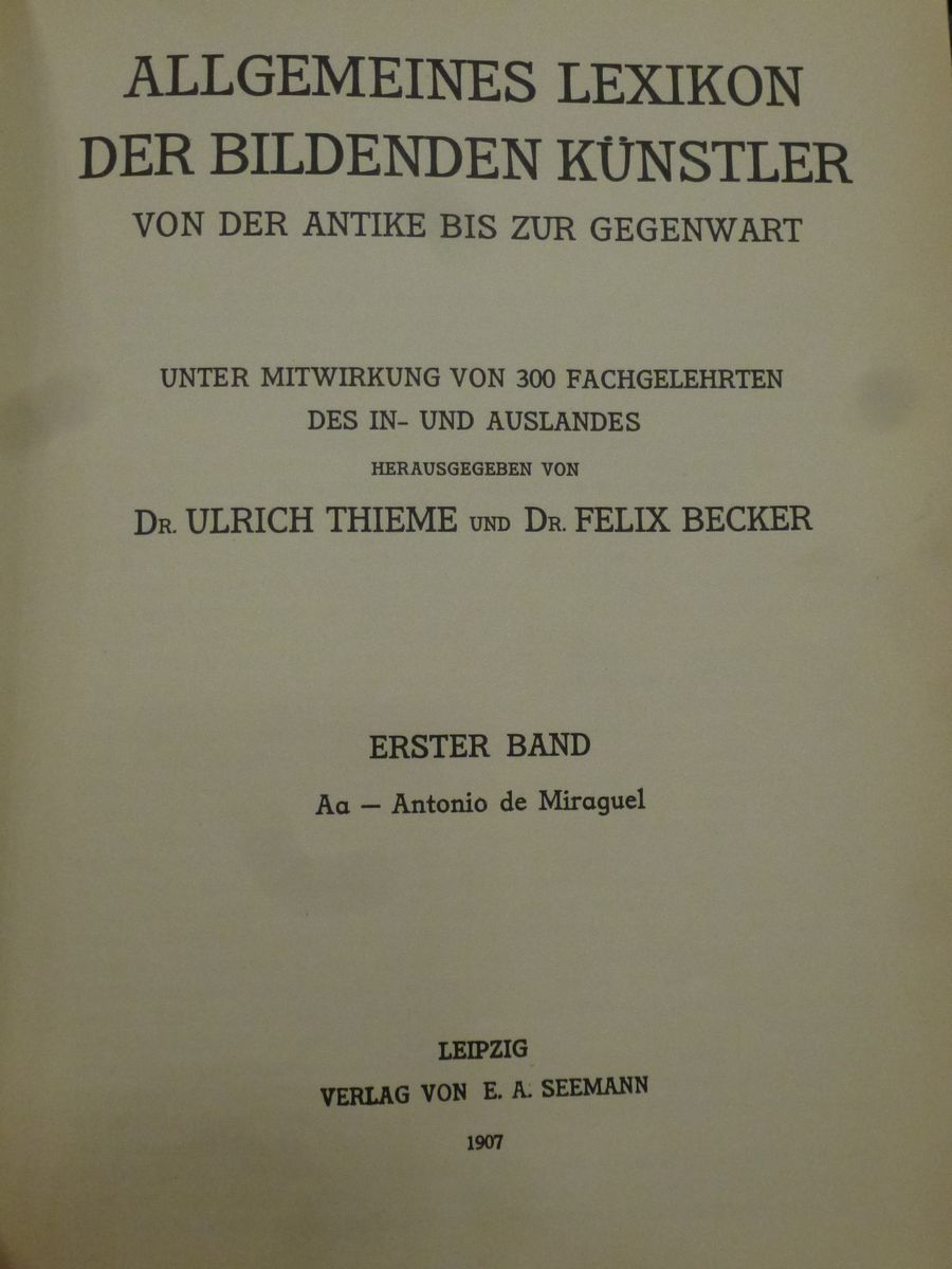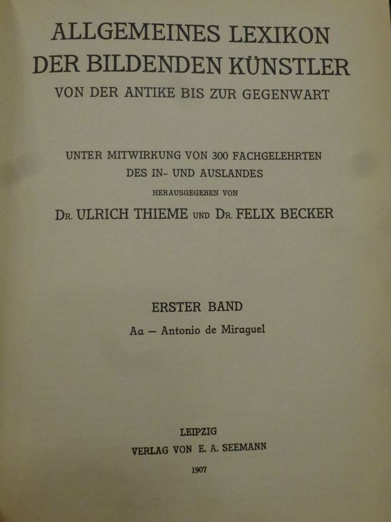 Allegemeines Lexikon der bildenden kunstler von der antije bis zur gegenwart. Leipzig, Verlag Von E. A. Seeman, 1965. Volumi dal numero 1 al numero 37.