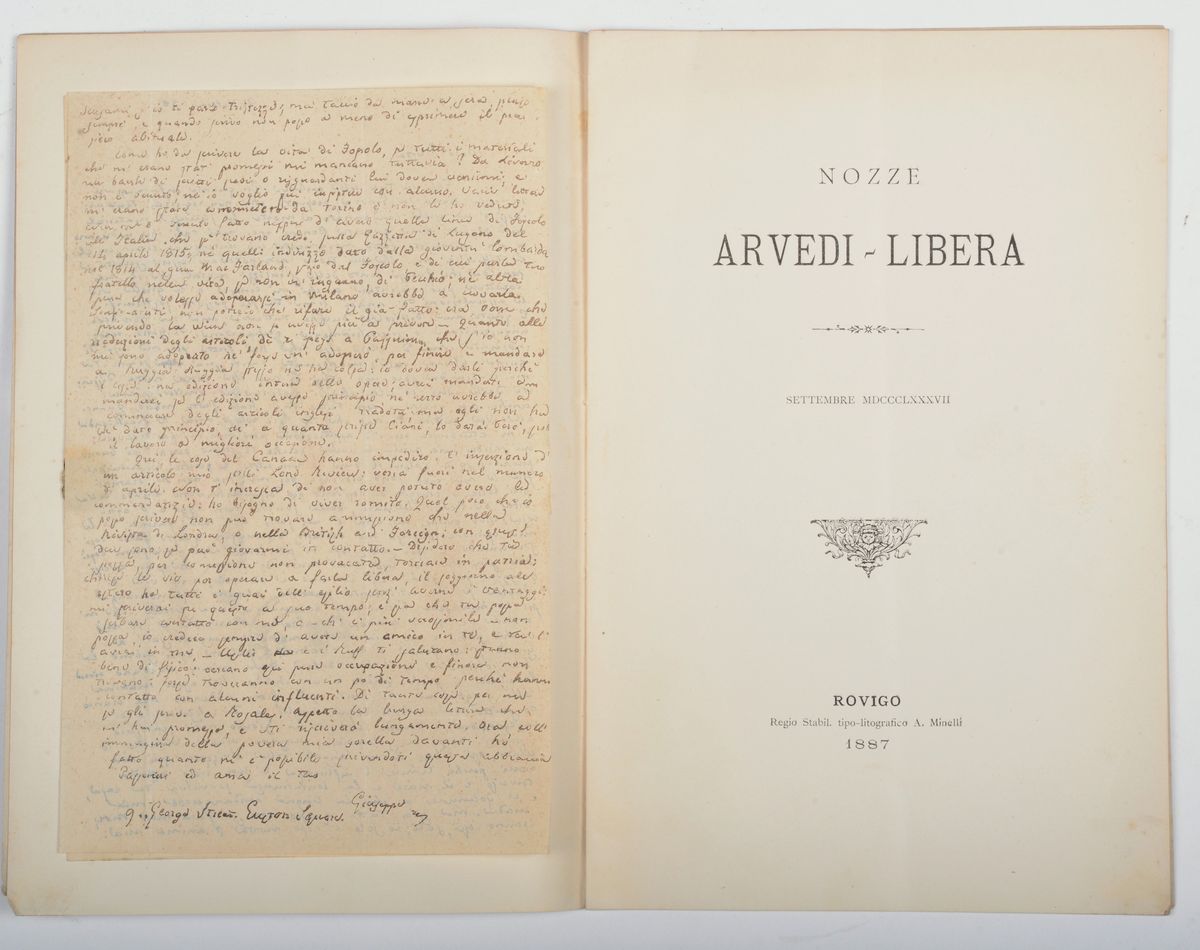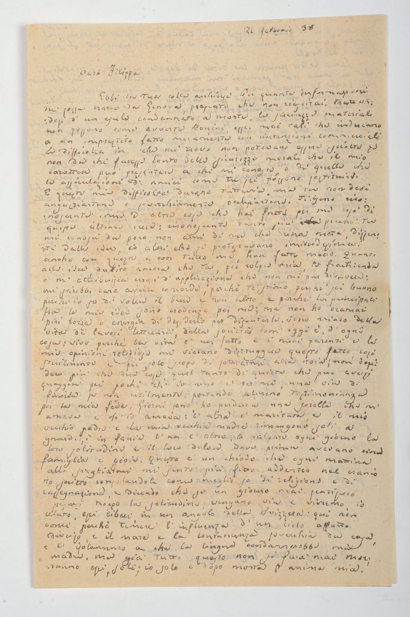 Bella lettera autografa datata 26 febbraio 38 (1838). Vergata in chiara ed elegante grafia da Giuseppe Mazzini, durante l'esilio londinese ed indirizzata all'esule svizzero Filippo Ugoni. Si allega fascicolo stampato per le nozze Arvedi-Libera, dove per la prima volta la nostra lettera viene pubblicata.