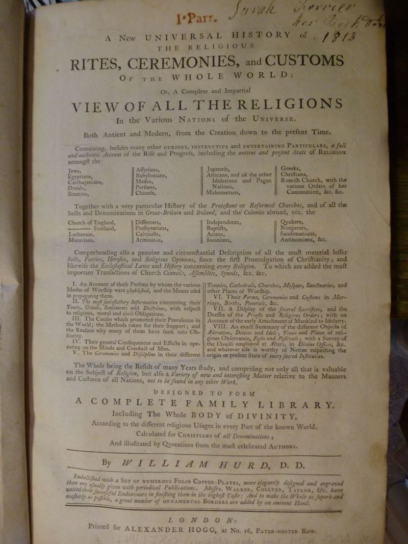 Lotto di volumi religiosi (28 volumi in totale). Tra cui: William Hurd, A new Universal History of the Religious rites, ceremonies and customs of the wholw world: or a complete and impartial view of all the Religions in the various Nations of the Universe. London, Alexander Hogg, 1779-1780. / Cardinal de Noailles, Office tirés de l'écriture Sainte, pour tous les jours du mois.. Paris, Lamy, 1783. (quattro tomi).