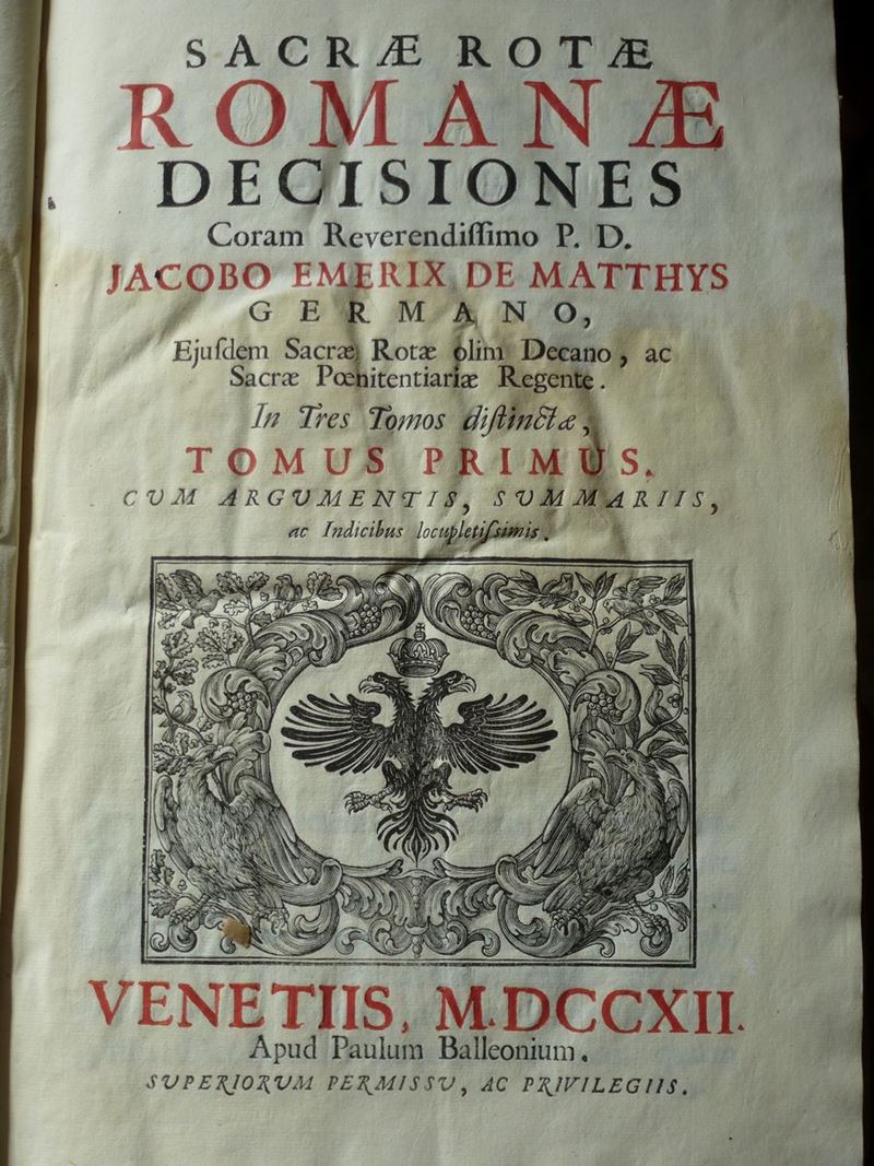 Venezia,Fioravanti da Prato,1586. Uniti nel lotto: Emerix,Jacobo. Sacrae rotae Romananae decisiones..Venezia,Belleoni,1712. Tre tomi rilegati in due volumi./De Rosa,Carolo. Consuetudines napolitanae..Napoli,Longi,1677.(Legatura staccata).
