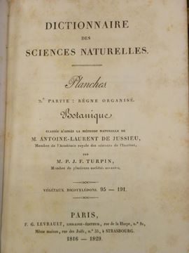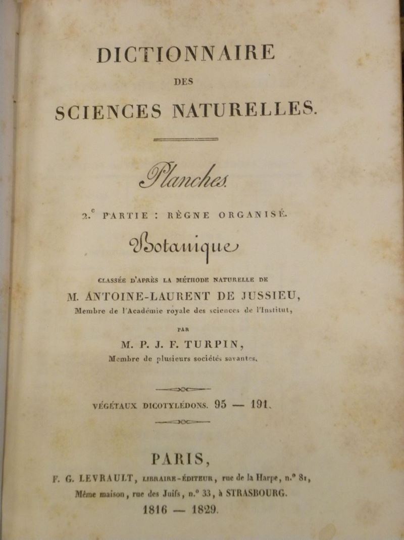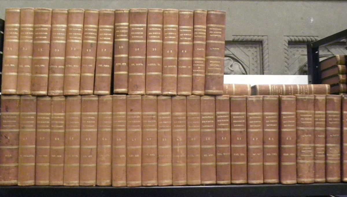 Dictionnaire de sciences naturelles... Strasbourg, Paris, 1816-1830. 60 volumi più 7 volumi di tavole. Legature coeve in mezza pelle. Illustrato da centinaia di tavole a colori.
