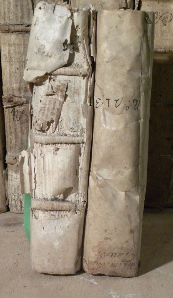 Decisiones causarum rotae lucensis. Lucca, Vincentii Busdrachi, 1578. Legatura coeva in pergamena floscia (parzialmente staccata). / Jacopo Menochii, Commentaria... Venezia, Somasco, 1567. Legatura coeva in pergamena floscia.