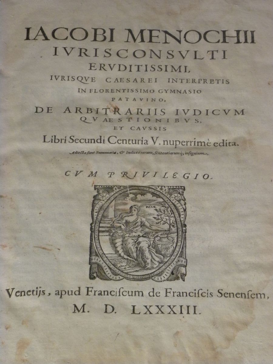 De arbitratis iudicum quaestionibus et caussis. Venetis, Franciscum de Franciscis, 1583. Legatura coeva in pergamena rigida con mancanze.