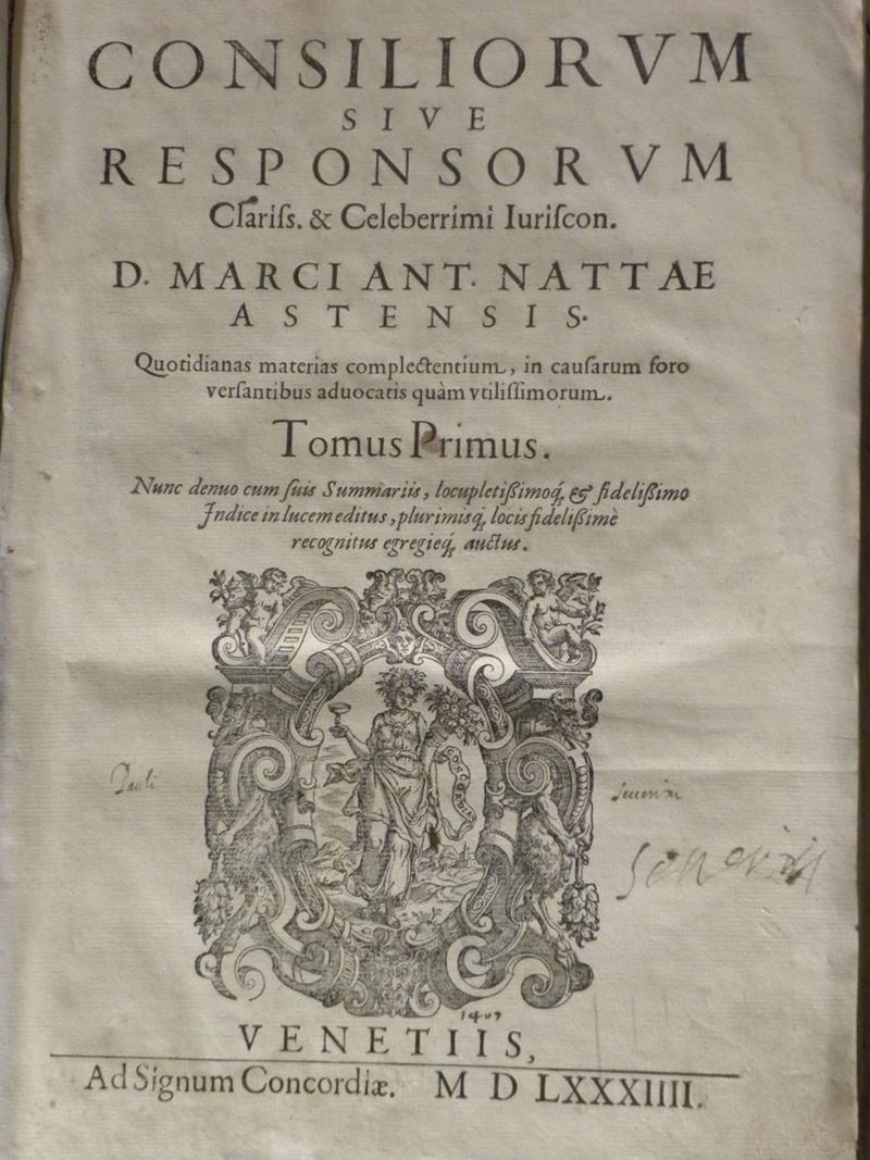 Consilorum sive responsorum. Tomi primo e secondo, Venezia, Ad Signum Concordiae, 1584. Rilegatura coeva in pergamena rigida. Piatto posteriore mancante. Ultimo quaderno parzialmente staccato.