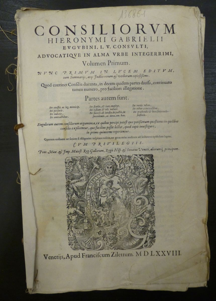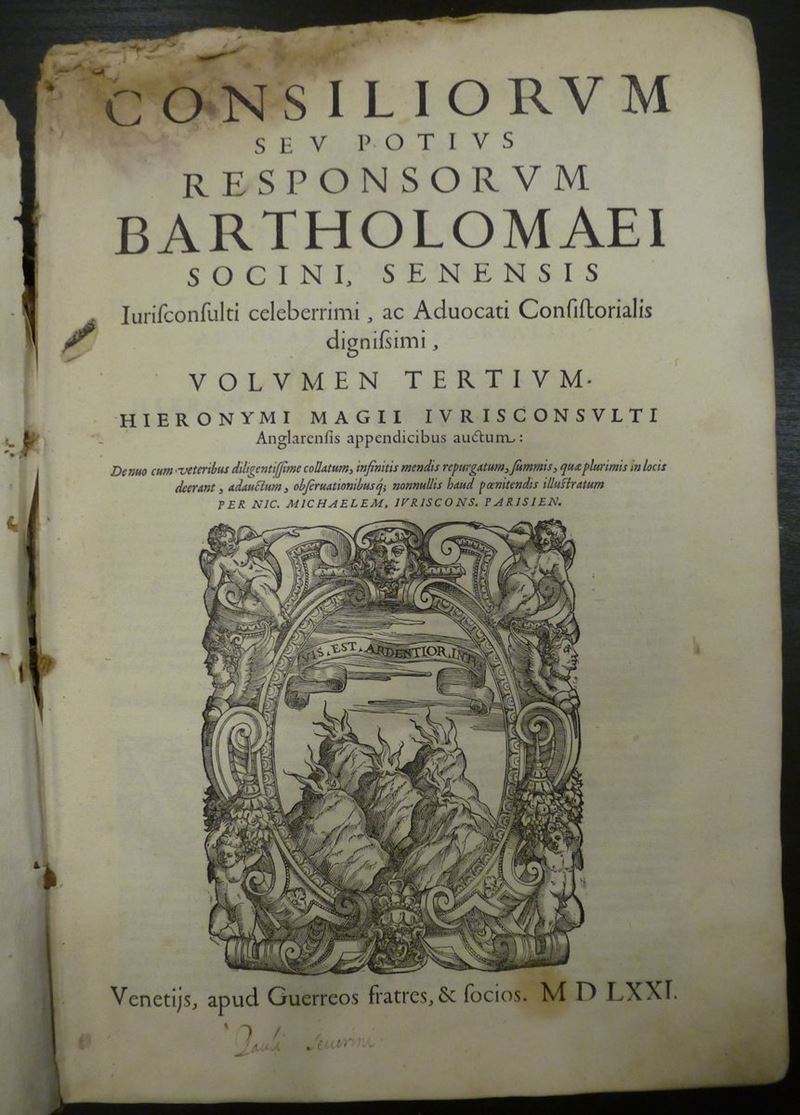 Consiliorum...volumen primum (il solo presente). Venezia, Franciscum Zilettumm, 1578. Manca la legatura. Conservato il solo piatto anteriore. Fogli sciolti in fine. / Insieme nel lotto: Socini Bartolomeo, Consiliorum... volumen tertium. Venezia, Guerreos Fratres, 1571. Grave danno di umidità che riguarda gran parte del volume.