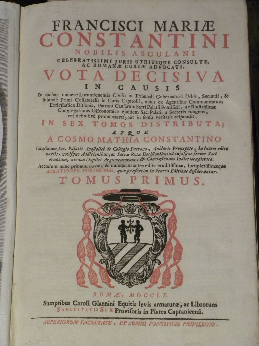 Vota decisiva coordinata, aucta, et in sex tomos distributa.. Roma, Giannini, 1756-1760. (Cinque tomi. Il tomo quarto e il quinto sono legati insieme). Si unisce, Additio Posthuma...Roma, Giannini, 1760. (Tomo sesto).