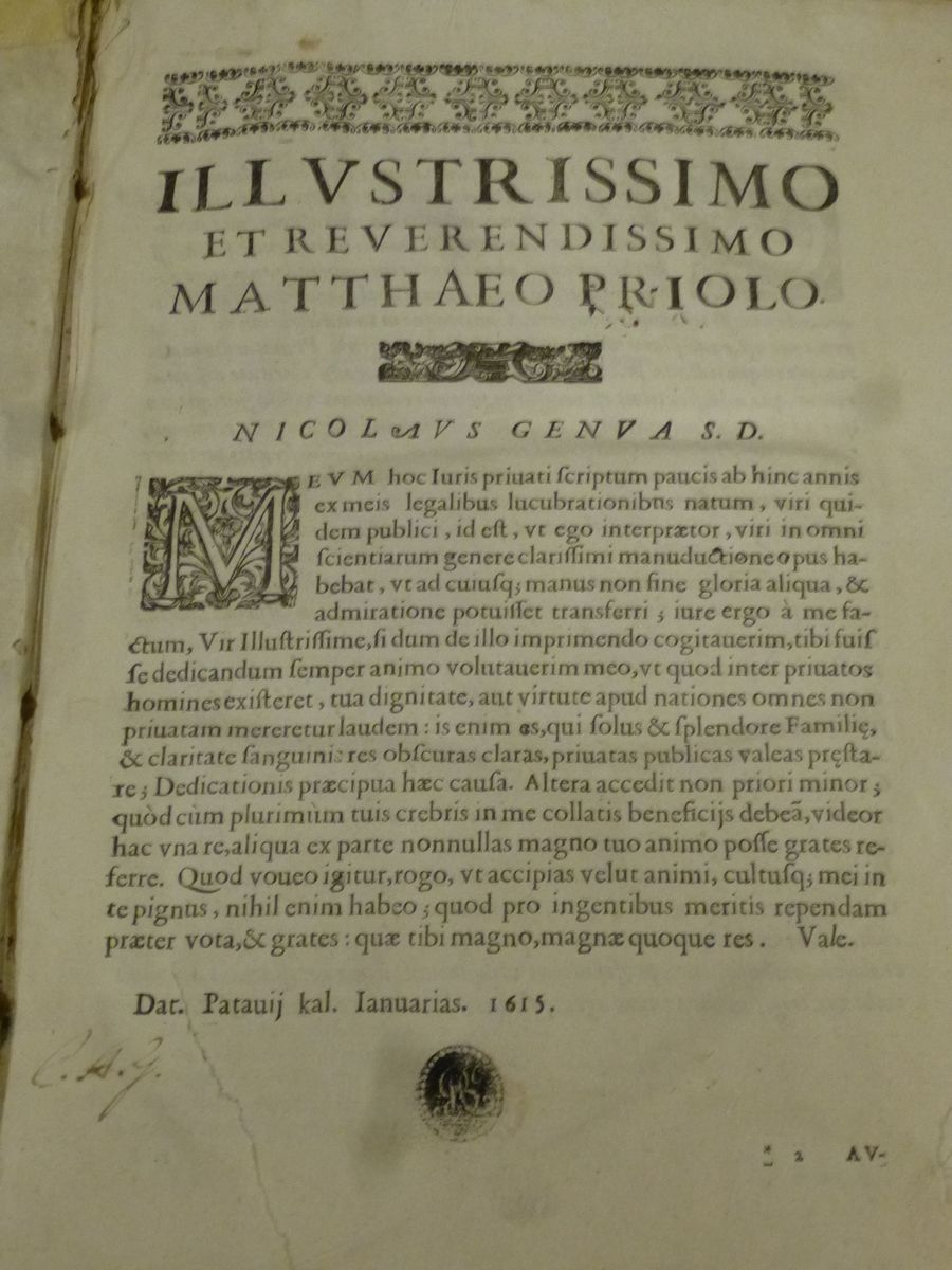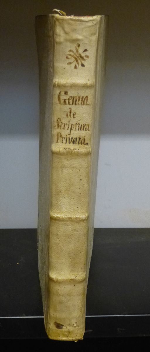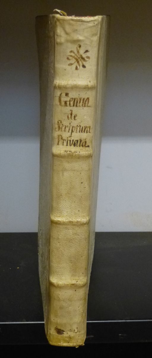De scriptura privata... manca il frontespizio, 1615 (?), Venezia (?). Legato insieme a: De enunciativis verbis tractatus. Venezia, Meiettum, 1621. Legato insieme a: Tractaus de scriptura privata liber sextus... Nova aditamenta, Venezia, Zenari, 1617. Legatura coeva in mezza pergamena rigida