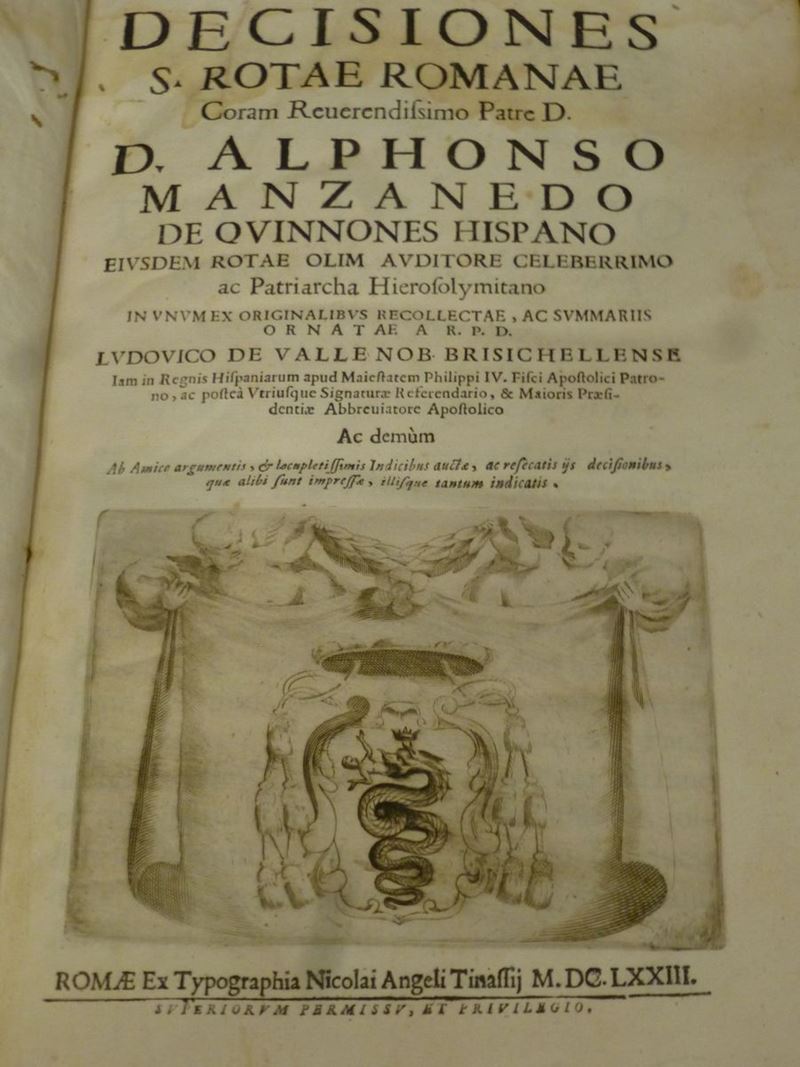 Decisiones s. Rotae romanae. Roma, Nicolai Angeli Tinassi, 1673. Legatura coeva in pergamena rigida. Gore nelle ultime pagine