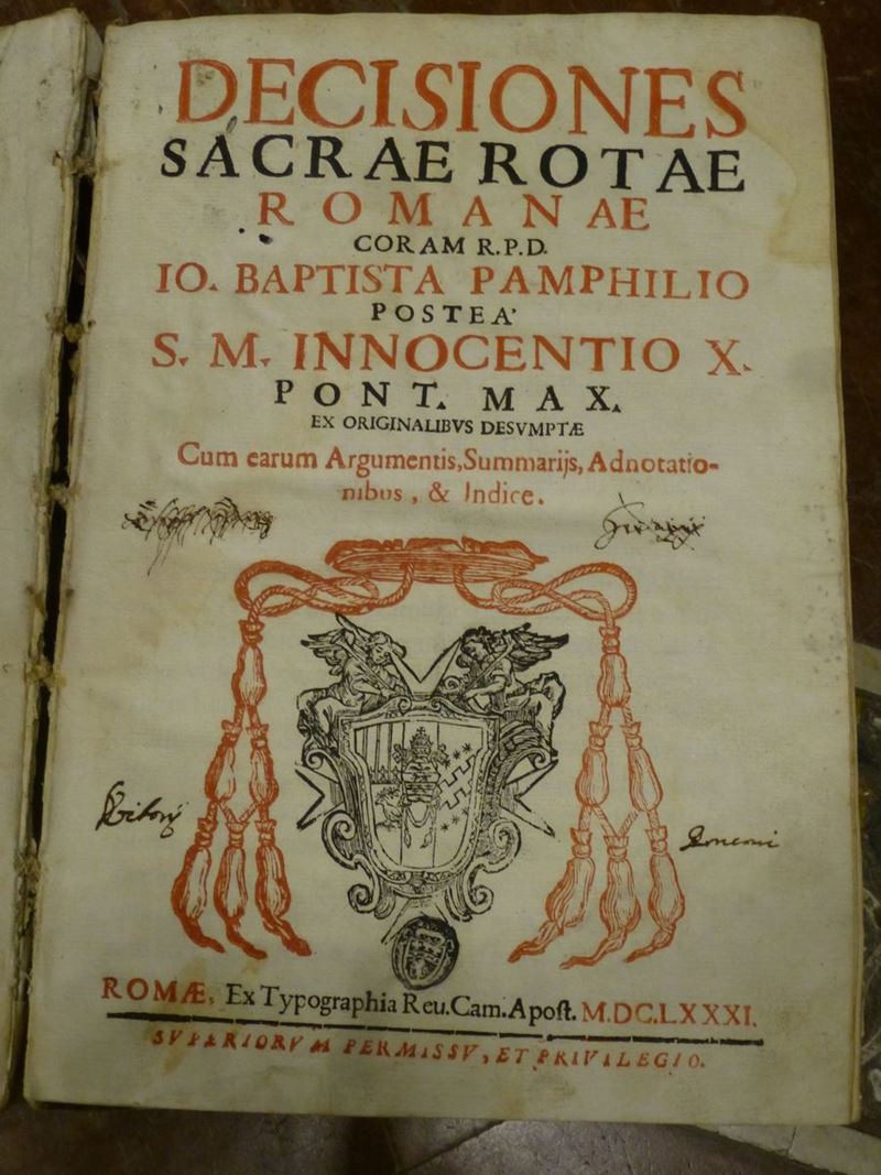 Decisiones Sacrae Rotae. Camerale Apostolica, Roma, 1681. Legatura coeva in pergamena rigida.