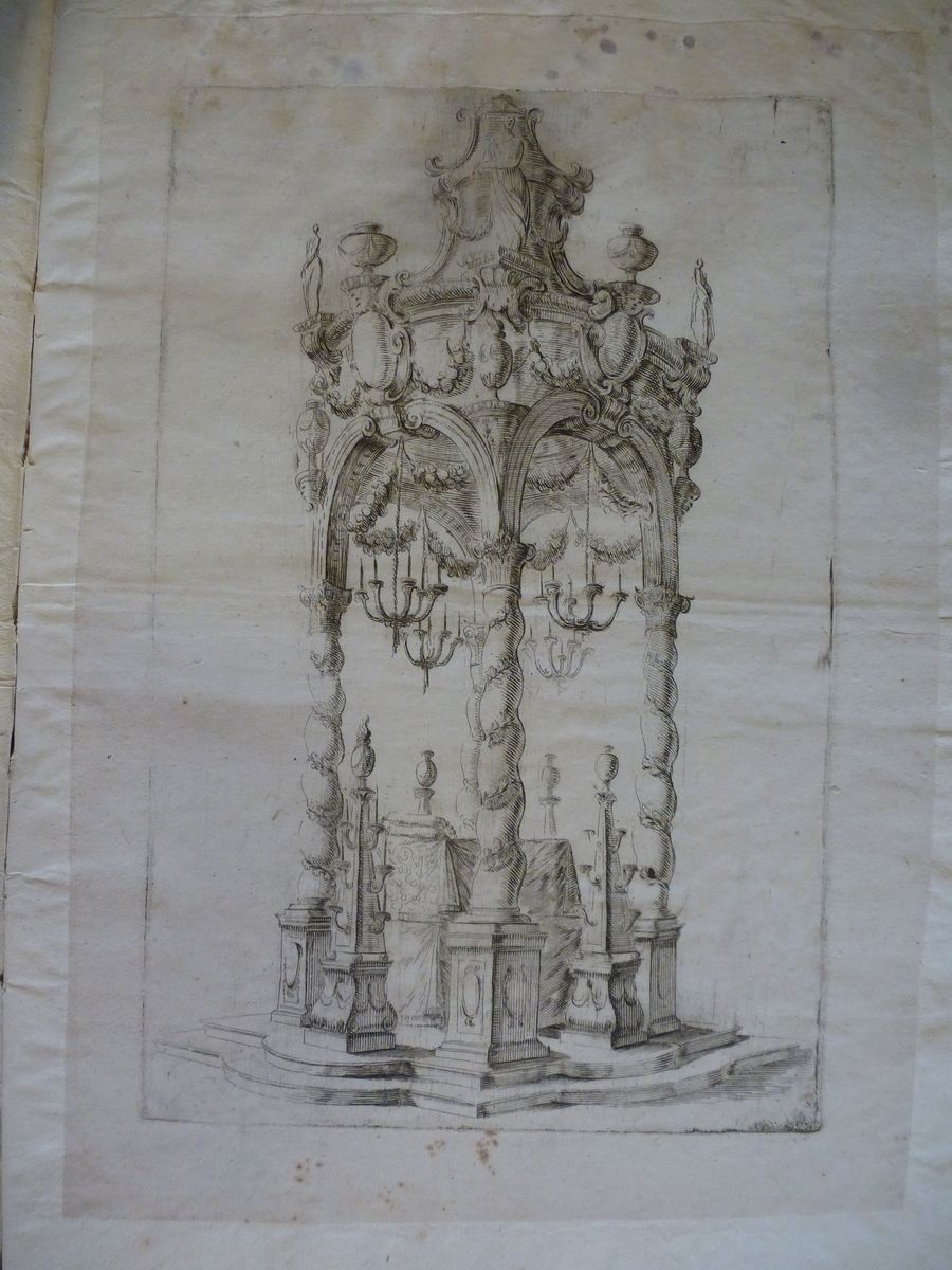Raccolta di 40 incisioni e disegni di architettura. del Sec.XVIII. Legatura del sec. XIX in mezza pergamena e punte molto rovinata.Difetti da umidità che riguardano molte delle carte presenti.