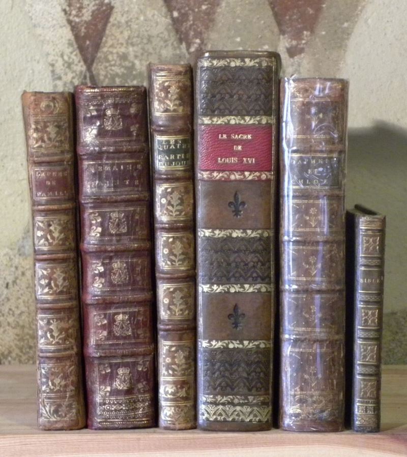 Paris,Vente,1775. Si uniscono nel lotto:Les amours pastorales de Daphnis et de Chloé, par Longus..A Paris,Imprimees pour les curieux,1757 e altre quatro opere figurate in belle rilegature.