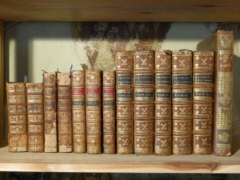 Paris,Muguet,1685. Cinque tomi. Legature coeve in piena pelle(Abrasioni e difetti).Esemplare un poco brunito./ Montaigne,Michel de. Essais.Pari,Servier,Bastien,1793. Legature coeve in piena pelle.(Difetti alle cuffie e piccole abrasioni) e altre tre opere in lingua francese tra cui Abregè de l'histoire romaine,Paris,Moutardier,1805, con 49 belle incisioni.