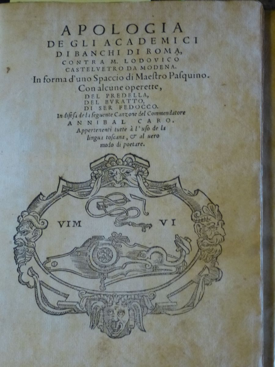 Apologia de gli academici di banchi di Roma, contra M.Lodovico Castelvetro da Modena. In forma d'uno spaccio di Maestro Pasquino. Con alcune operette, del Predella,del Buratto,di ser Fedocco. in difesa de la seguente Canzone del Commendatore Annibal Caro..