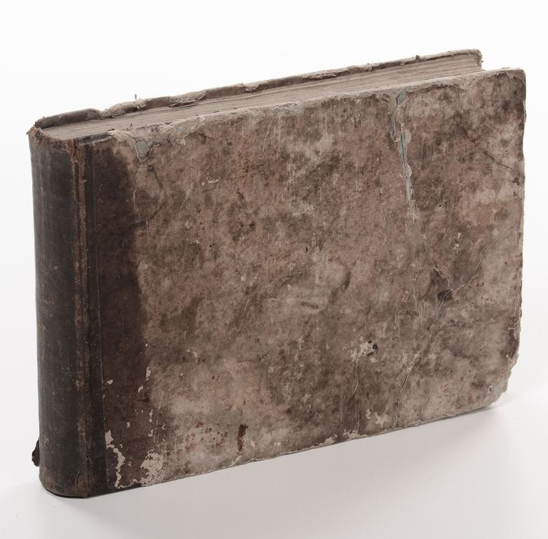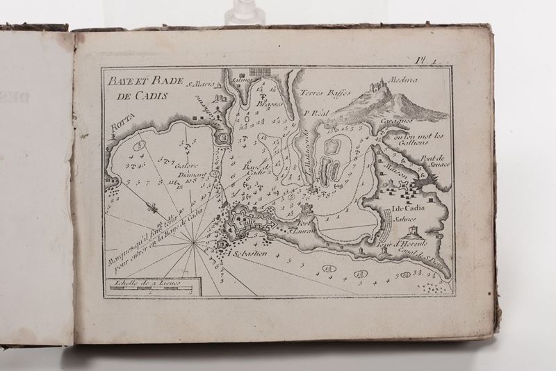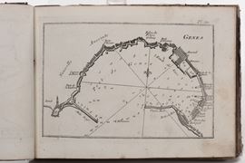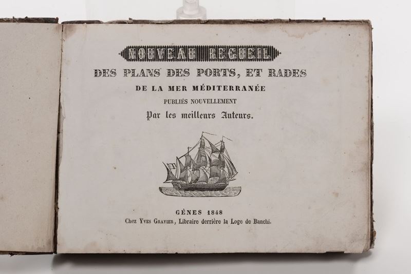 Genes,Chez Yves Gravier,1848.In ottavo oblungo.Legatura coeva in mezza pelle(abrasioni e mancanza ad un angolo). Macchia alle ultime venti carte. Bella raccolta di 180 carte raffiguranti i porti e le rade del Mediterraneo.