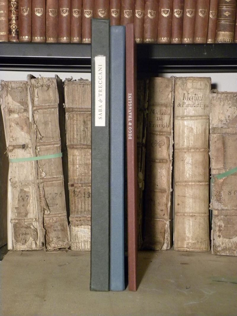 Esemplare a fogli sciolti entro camicia e custodia editoriale, tiratura numerata di 150 esemplari (nostro n° 107). Unito a: Giuliano Dego ed Edgardo Travaglini, da Picadilly a Westminster. Verona, Riva, 1972. Esemplare a fogli sciolti entro camicia e custodia editoriale. Unito a: Lucrezio de rerum Natura, acqueforti di Bruno Saetti. Verona, Riva, 1968. Edizione numerata di 150 esemplari (nostro n °106), brossura editoriale entro camicia e cofanetto.