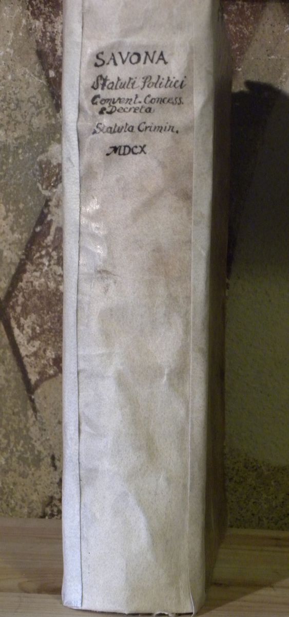 Genova,Pavoni,1610. Frontespizio lacunoso,Difetti e mancanze. Ex libris manoscritti. (Legato con:)Concessioni decreti et ordini della città di Savona,Concessi dalla Serenissima Repubblica di Genova..Genova,Pavoni,1610.(Legato con:) Statuta criminalia civitatis Saonae..Genuae,Pavonem,1610. Manca una carta in fine integrata manoscritta. Edizione assai rara, purtroppo in esemplare modesto.