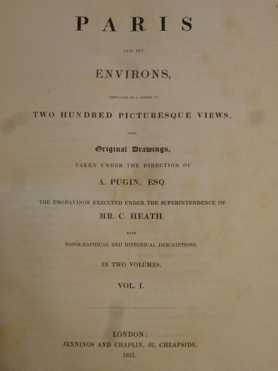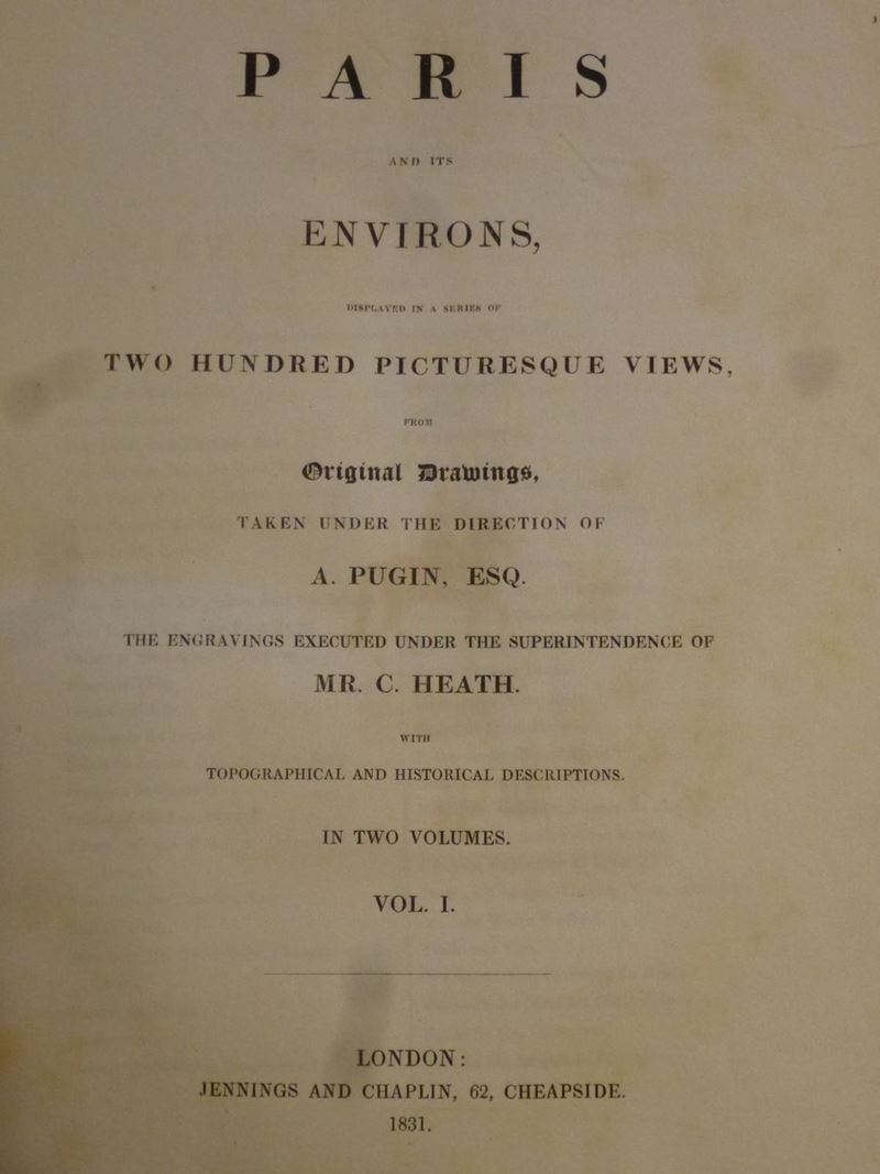 Paris and its environs, displayed in a series of picturesque views. London, Robert Jennings, 1829. Due tomi. / J. A. Dulaure, Histoire physique, civile et morale de Paris... Bruxelles, H. Tarlier, 1826. 10 volumi di testo più uno di Atlante (1827).
