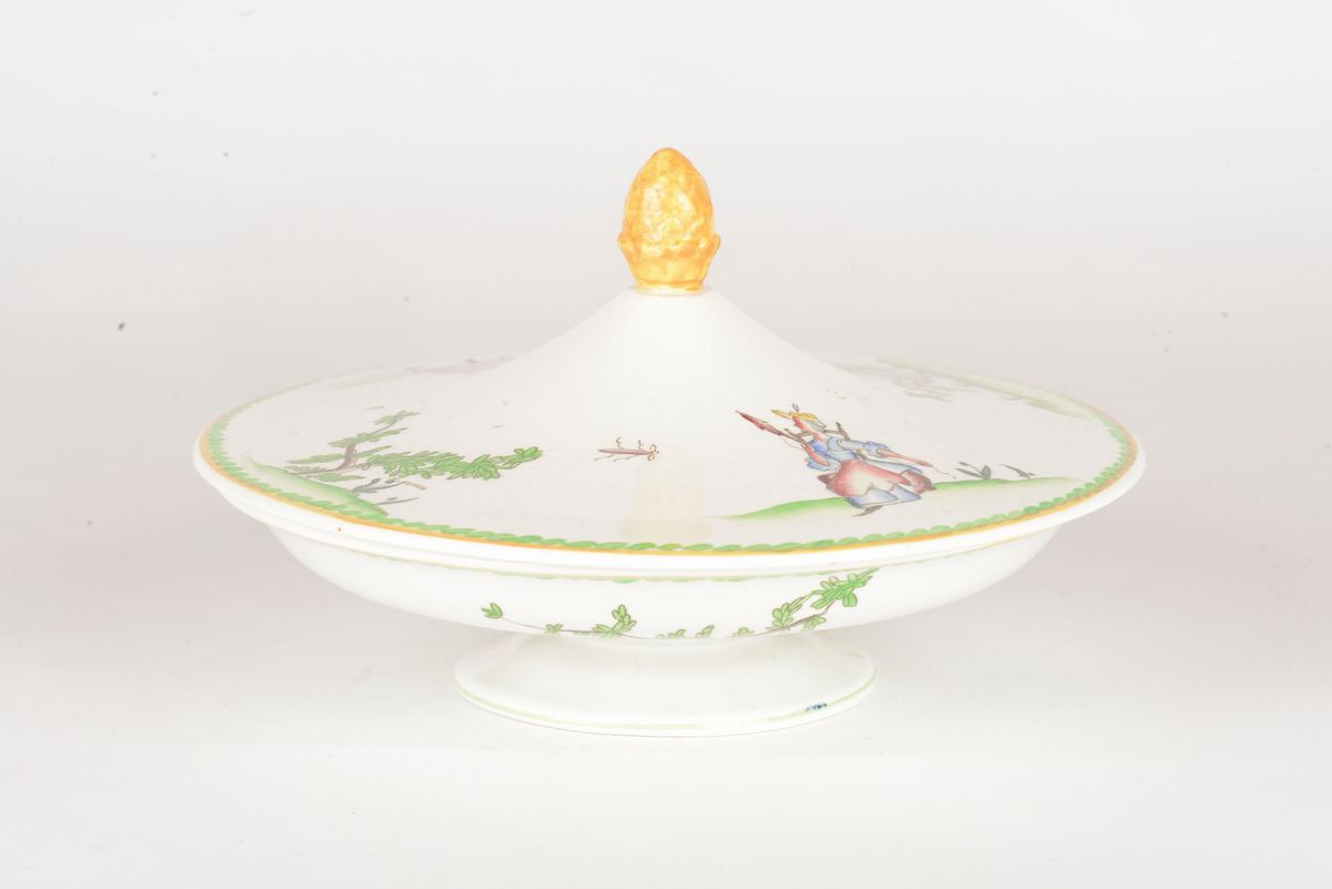 Scatola in ceramica decorata in policromia con figure ed alberi. Diametro cm 18, altezza cm 10