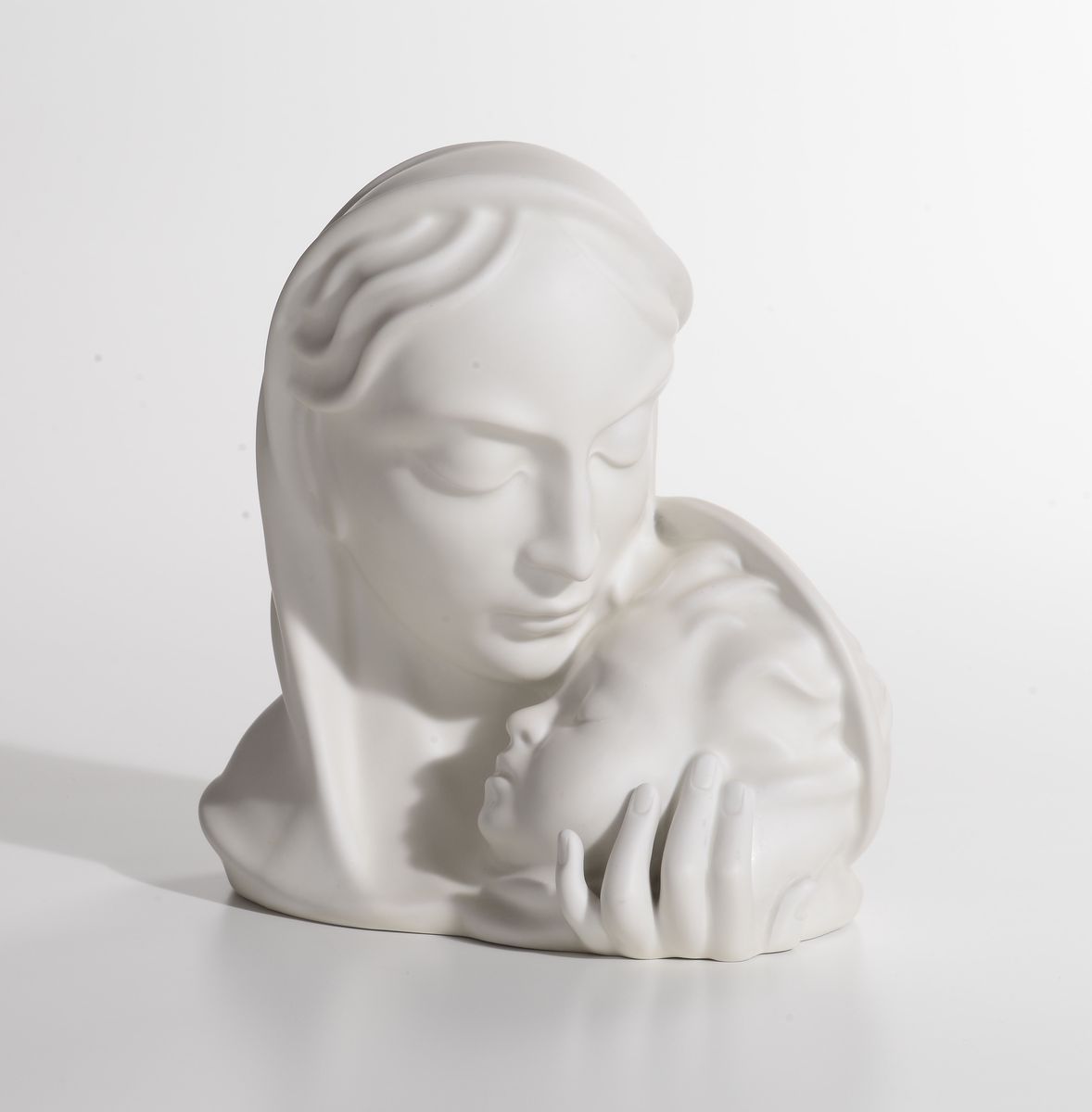 Gruppa in ceramica bianca raffigurante Madonna con Bambino. Marchio della manifattura sotto la base e firma sul lato.Altezza cm 23