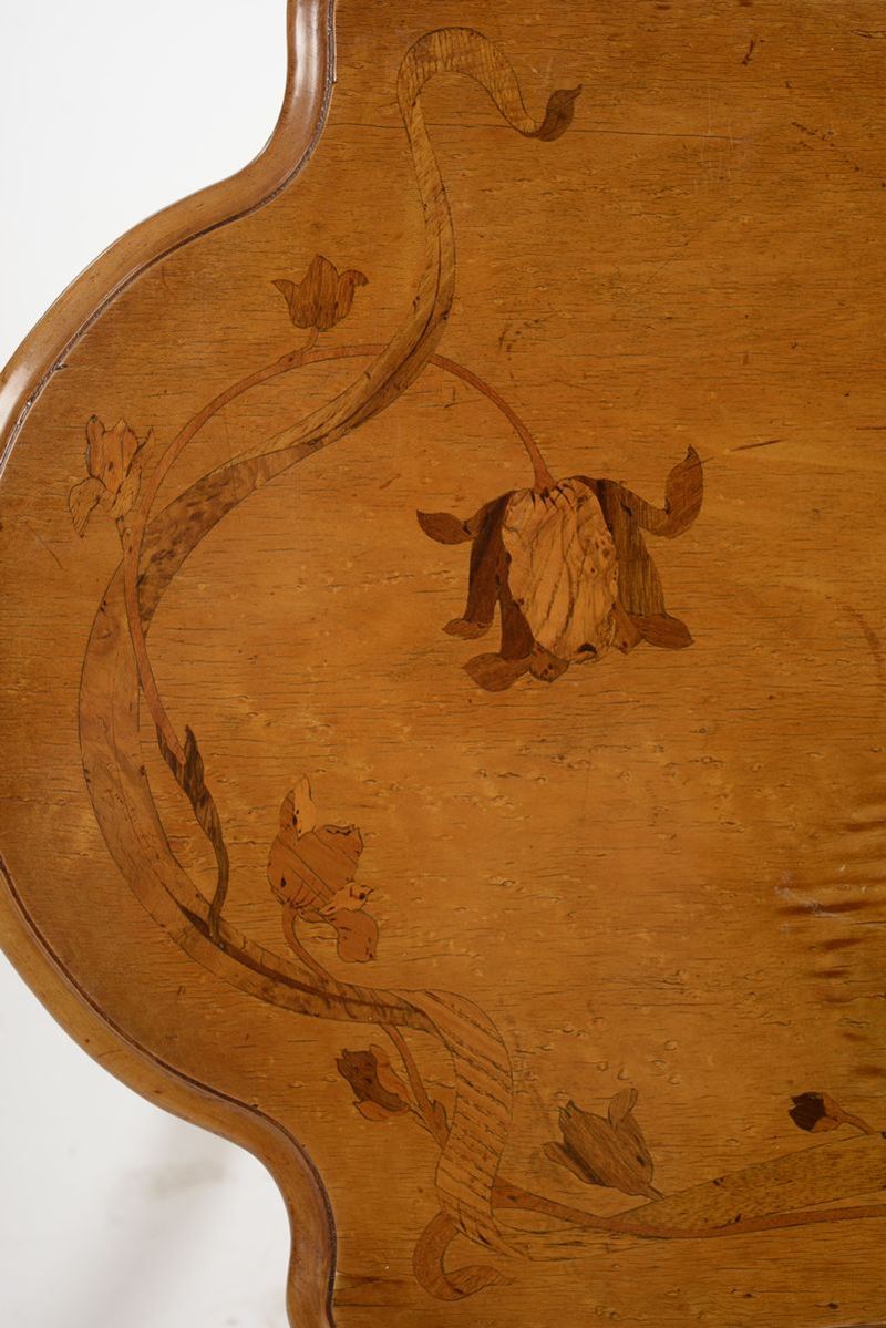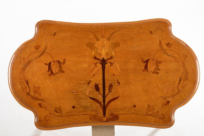 Tavolino in legno lastronato ed intarsiato, epoca Liberty