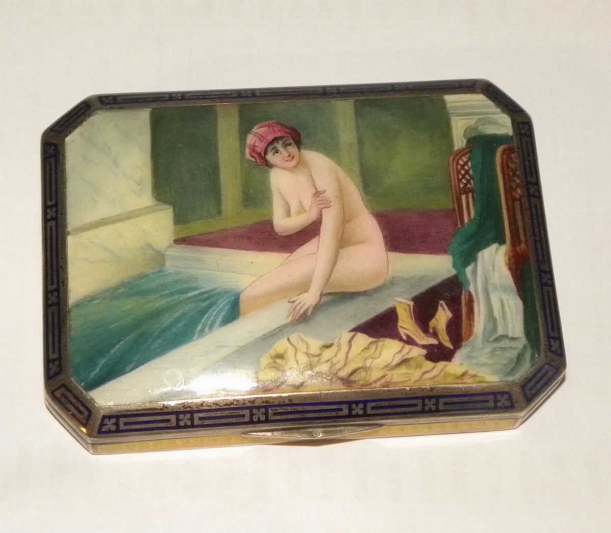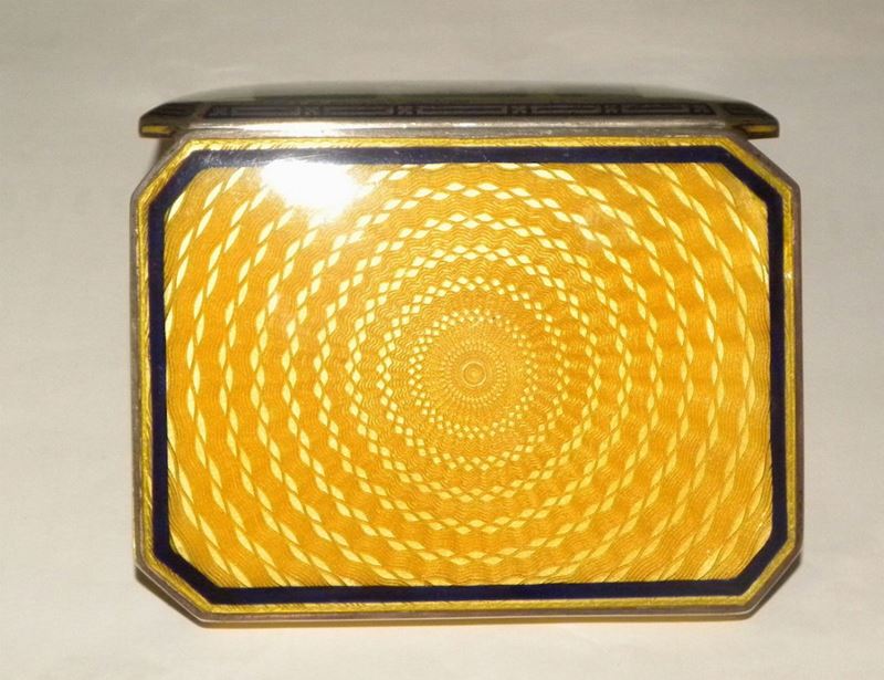 Piccola scatola in argento con figura femminile dipinta a smalto, Francia