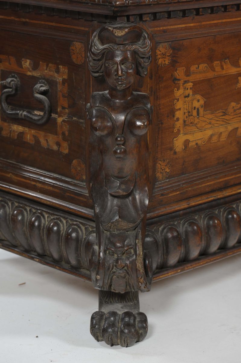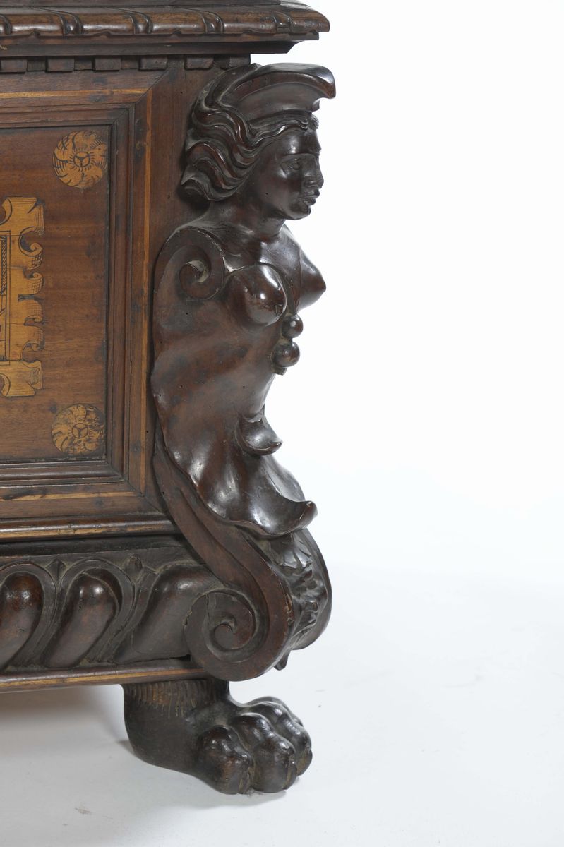 cm 182x60x65Piano a sargofago con cornice esterna intagliata a baccellature e dentello sottopiano.Corpo a fronte bipartito da stemma intagliato ed ai lati raffigurazioni intarsiate con riserve istoriate con figure di animali fantastici. Agli angoli cariatidi scolpite e parte inferiore con cornice baccellata recante al centro mascherone. Piedi ferini e maniglie laterali in ferro forgiato.Significativo esempio di cassapanca tardo rinascimentale che unisce modelli iconografici di ispirazione classica e fantastica realizzati con differenti tecniche esecutive
