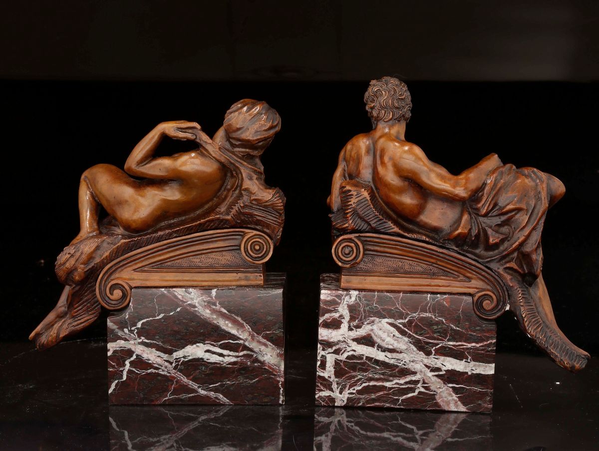 Coppia di figure in bronzo su basi in marmo colorato raffiguranti il Crepuscolo e l'Aurora, manifattura italiana del XIX-XX [..]