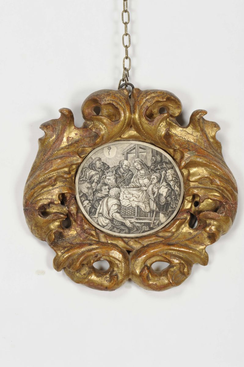Coppia di ovali in avorio inciso con raffigurazioni della Natività e del Cristo deriso entro cornici in legno intagliato con motivi fogliacei e dorato, arte dell'Italia del nord del XVII secolo