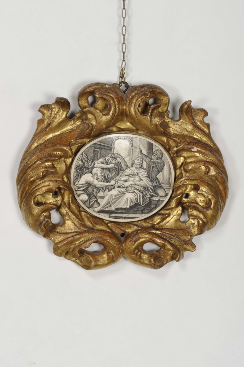 cm 15x13, con cornice cm 26x31I motivi iconografici degli ovali derivano con ogni probabilità da modelli pittorici o incisioni tardo-cinquecentesche di scuola lombarda