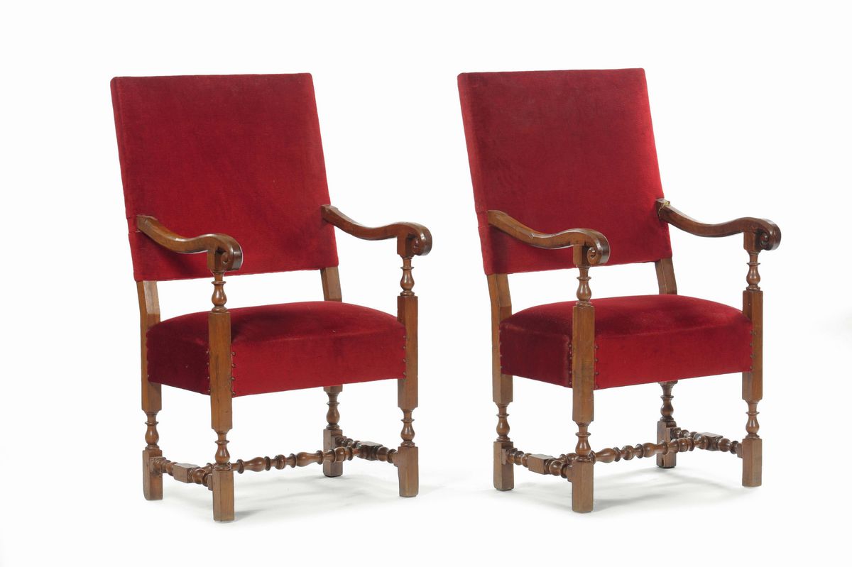 rivestimento in velluto di epoca moderna. I seggioloni, dalla ampia spalliera diritta e dai braccioli sagomati con finali a ricciolo, sono sostenuti da gambe e traverse con tornitura a rocchetto.
