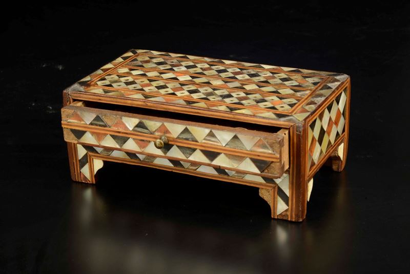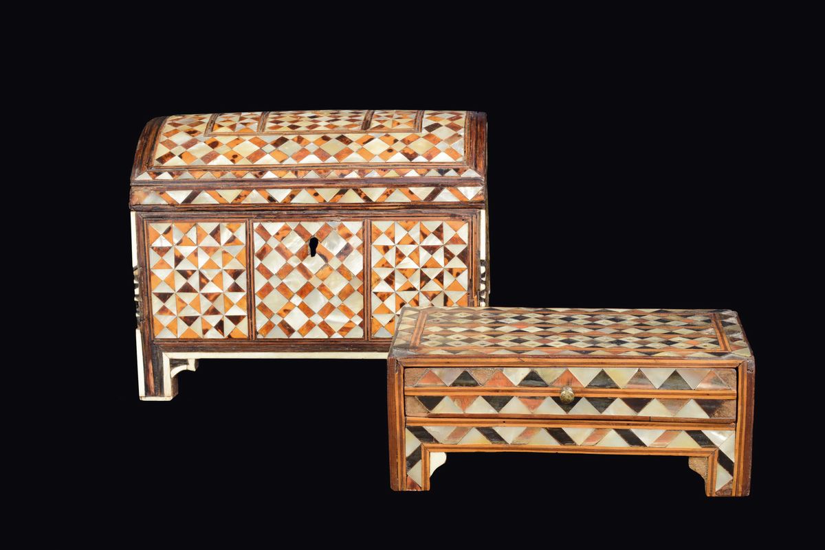 Due cofanetti in legno rivestito in tartaruga, madreperla e avorio, arte ottomana (Turchia?) XIX secolo