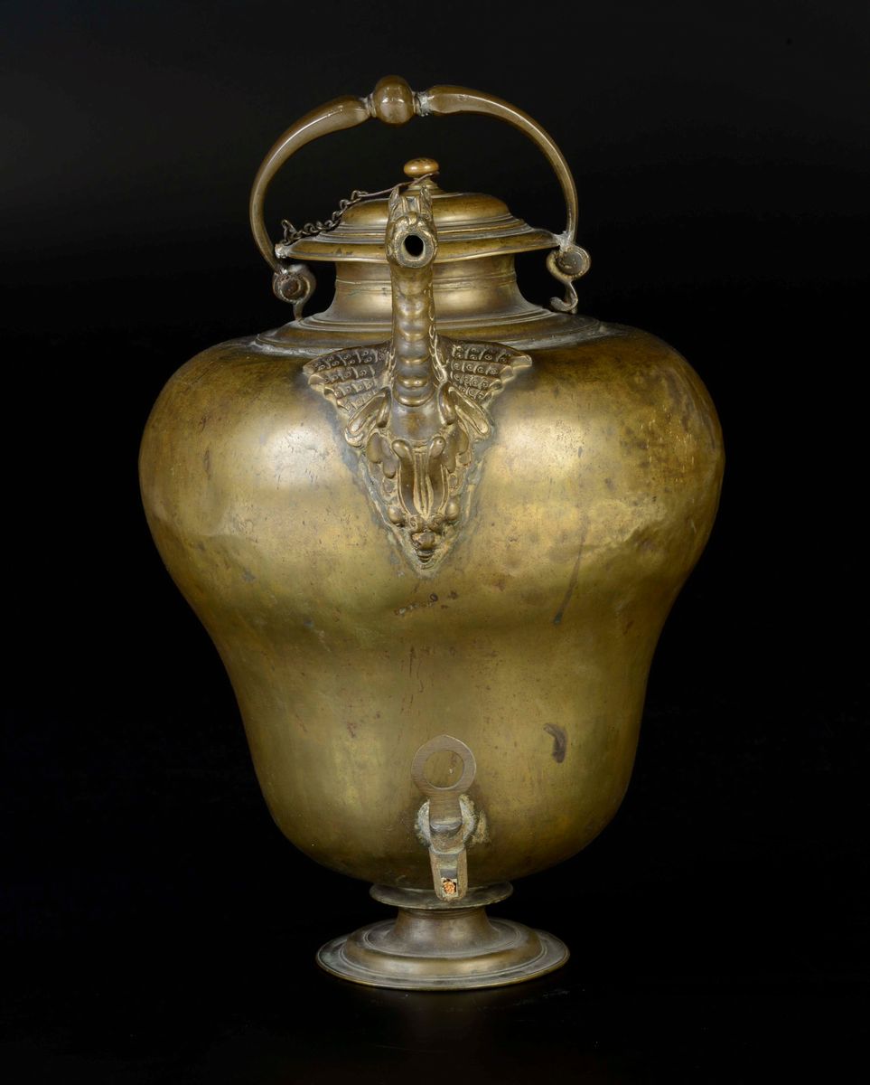 Grande acquamanile in bronzo fuso e cesellato e ottone sbalzato, Arte Italiana del XVI-XVII secolo, probabilmente Toscana