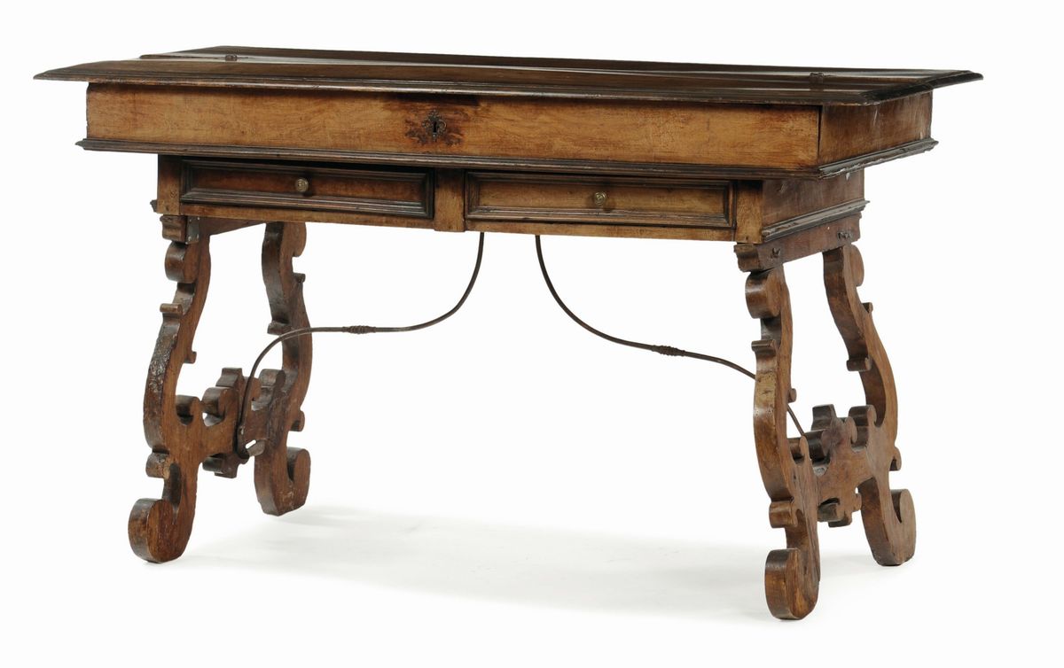 Piano rettangolare apribile con cornici intagliate ed ebanizzate; all'interno scarabattolo con piccoli tiretti allineati. Sul davanti dalla fascia sottopiano due cassetti con fronte incorniciato, sostegni pieghevoli a lira traforata con piedi a ricciolo uniti al piano con cerniere e sproni in ferro forgiato, cm 117x87x101 (restauri)