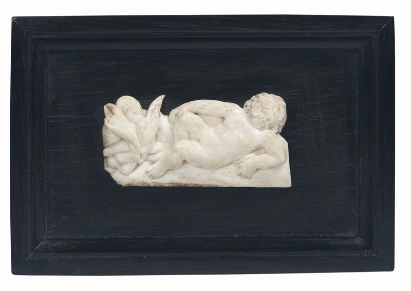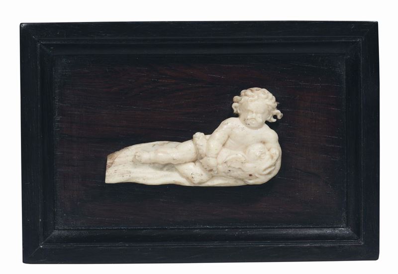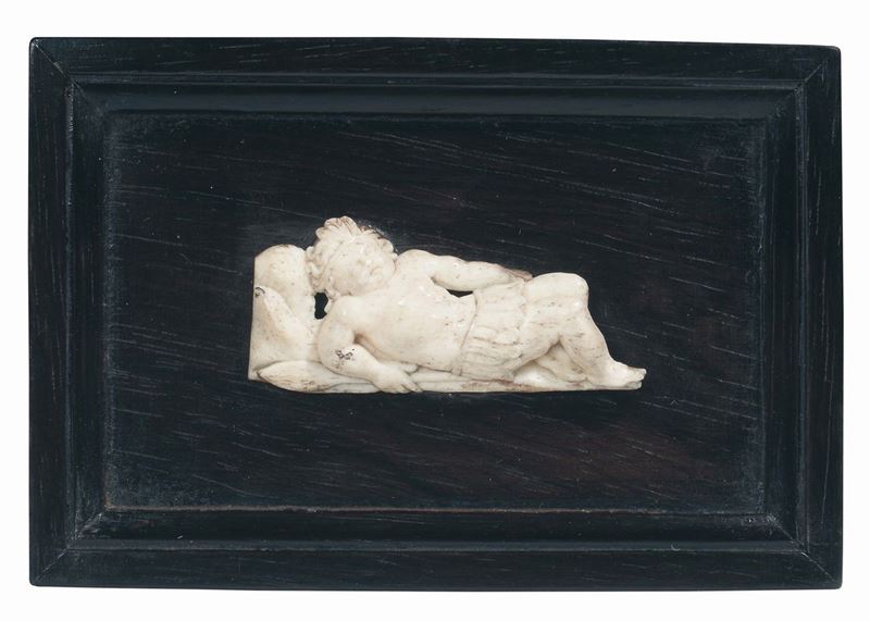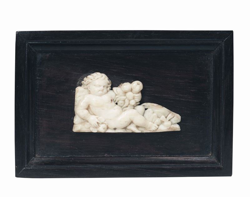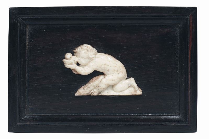 Gruppo di sei placchette in ebano contenenti figure di putti in avorio, Germania del sud XVII-XVIII secolo