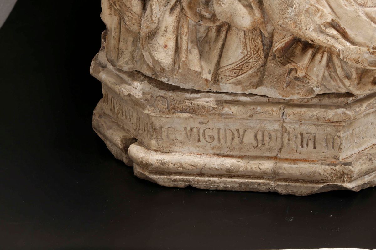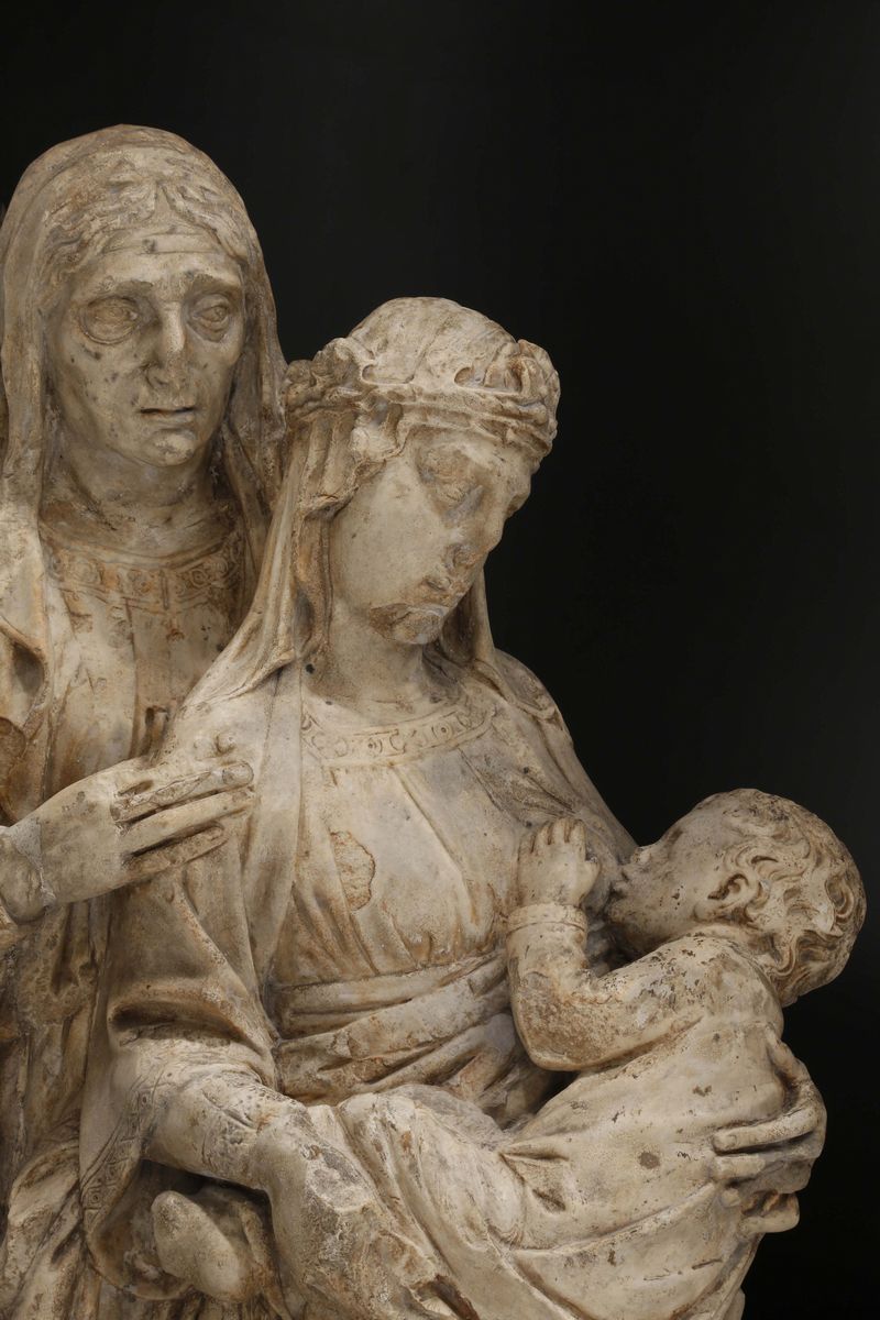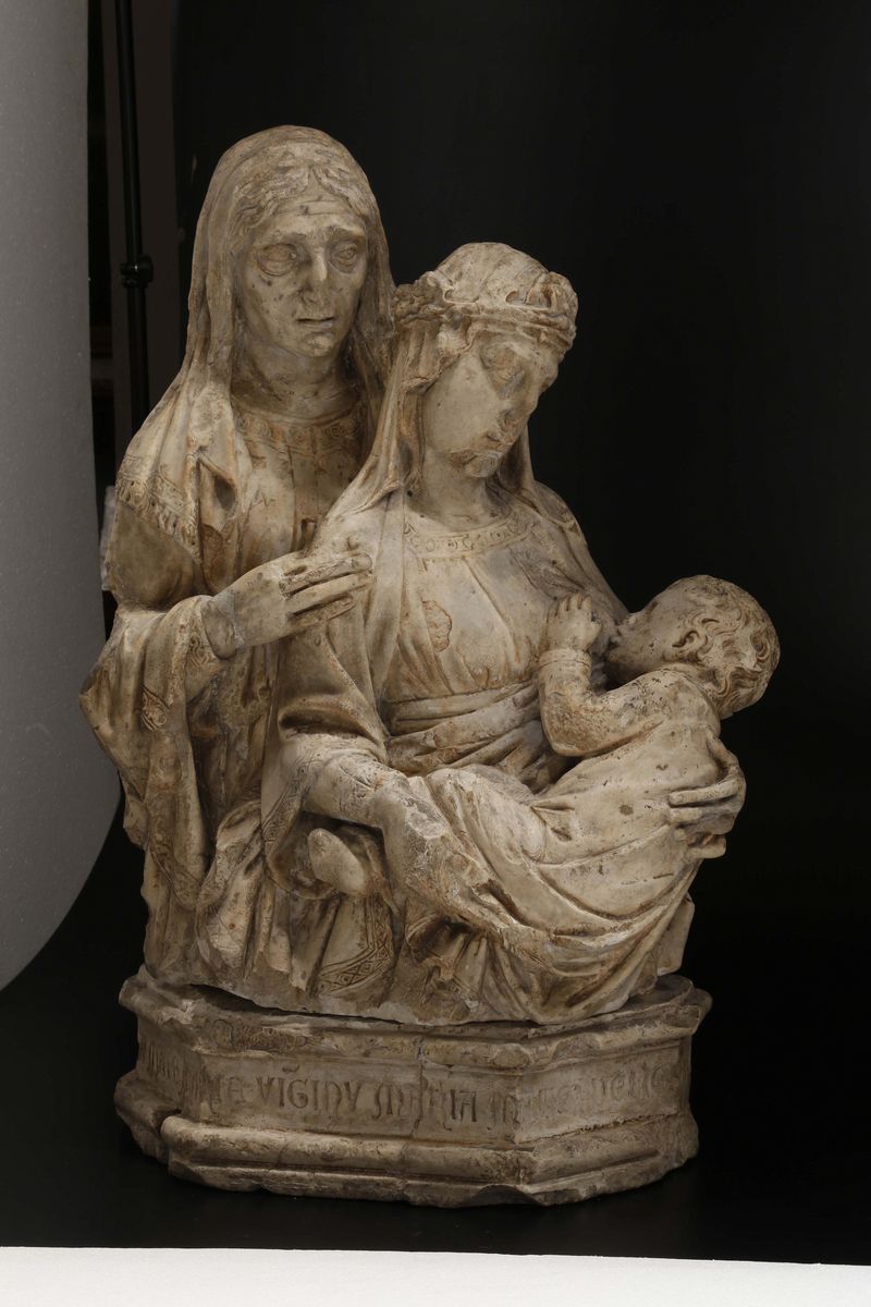 cm 60x62.La composizione, che rappresenta la Madonna nell'atto di allattare il Bambino con Sant'Anna che assiste alla scena poggiando amorevolmente la mano sulla spalla della Vergine, si ispira ai modi della scultura rinascimentale italiana del XIV secolo.Sia le molte incongruenze stilistiche, sia il tipo di consunture e rotture dichiaratamente artificiose fanno riferire la realizzazione dell'opera a quell'ambiente di imitatori e plastificatori operanti in Italia a cavallo tra Otto e Novecento ed in particolare allo stile di Alceo Dossena (Cremona 1878-Roma 1931).