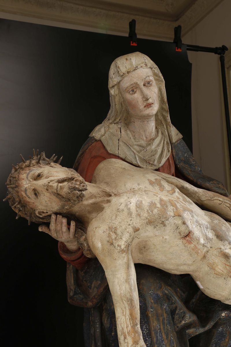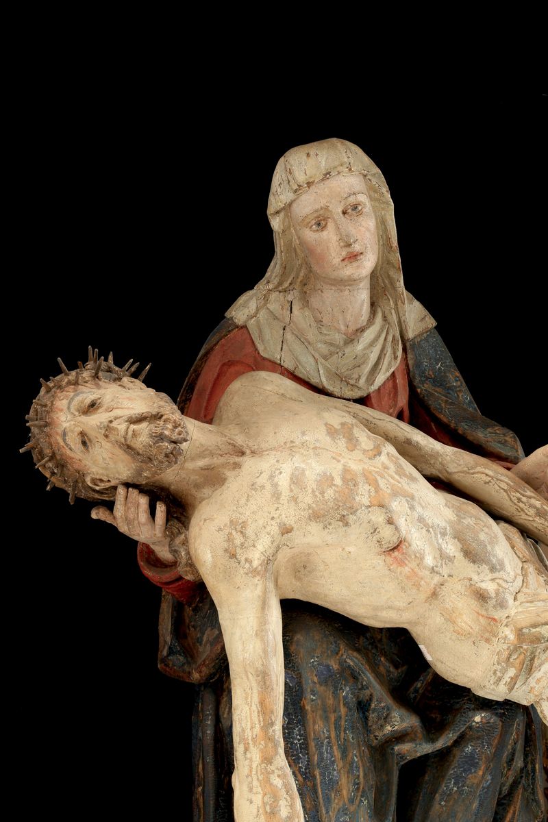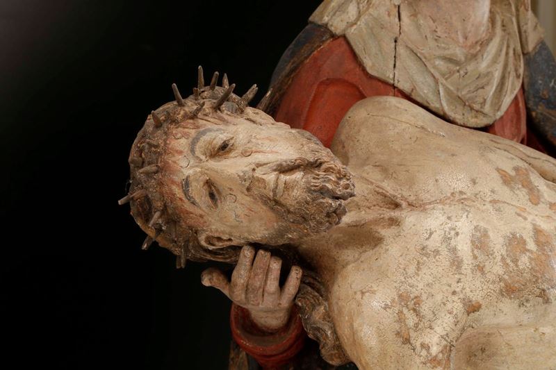 Questa importante rappresentazione lignea della Pietà ci mostra la figura del Cristo deposto dal corpo e dalle membra allungate ed abbandonate e fortemente connotate da un pathos anatomico reso dalla nervosa evidenza di muscoli e delle vene. Il volto, incorniciato da una corta barba a riccioli allungati, è lasciato libero dai capelli, raccolti e cadenti dietro la nuca, quasi ad indirizzare lo sguardo dell’osservatore verso la straordinaria espressività dello sguardo del Cristo nell’atto di abbandonare la vita terrena. La spigolosità della corona di spine e la rigidità delle linee delle vene e dei muscoli contrastano con la distaccata espressione del volto risolta dal taglio obliquo degli occhi e dalle alte sopracciglia arcuate. La figura della Madonna fa da sfondo alla drammatica rappresentazione, la mano sinistra tiene delicatamente sollevata la testa al figlio mentre quella destra semiaperta quasi la offre ai fedeli. La testa, leggermente reclinata ad indicare una sofferta fatica, è coperta da un candido velo che ricadendo sulle spalle incornicia l’ovale del volto premeato da una espressione di un calmo e rassegnato dolore. Il ductus stilistico della composizione fonde i modi del mondo tardo gotico ispirato da influenze nordiche espresse principalmente nella figura del Cristo, con modelli già marcatamente propri del Rinascimento veneto. Questo riuscito paesaggio stilistico identifica la zona di produzione della rappresentazione in quest’area stilistica e culturale espressa geograficamente tra Italia nord-orientale , Austria e bassa Germania. altezza cm 109 (difetti)