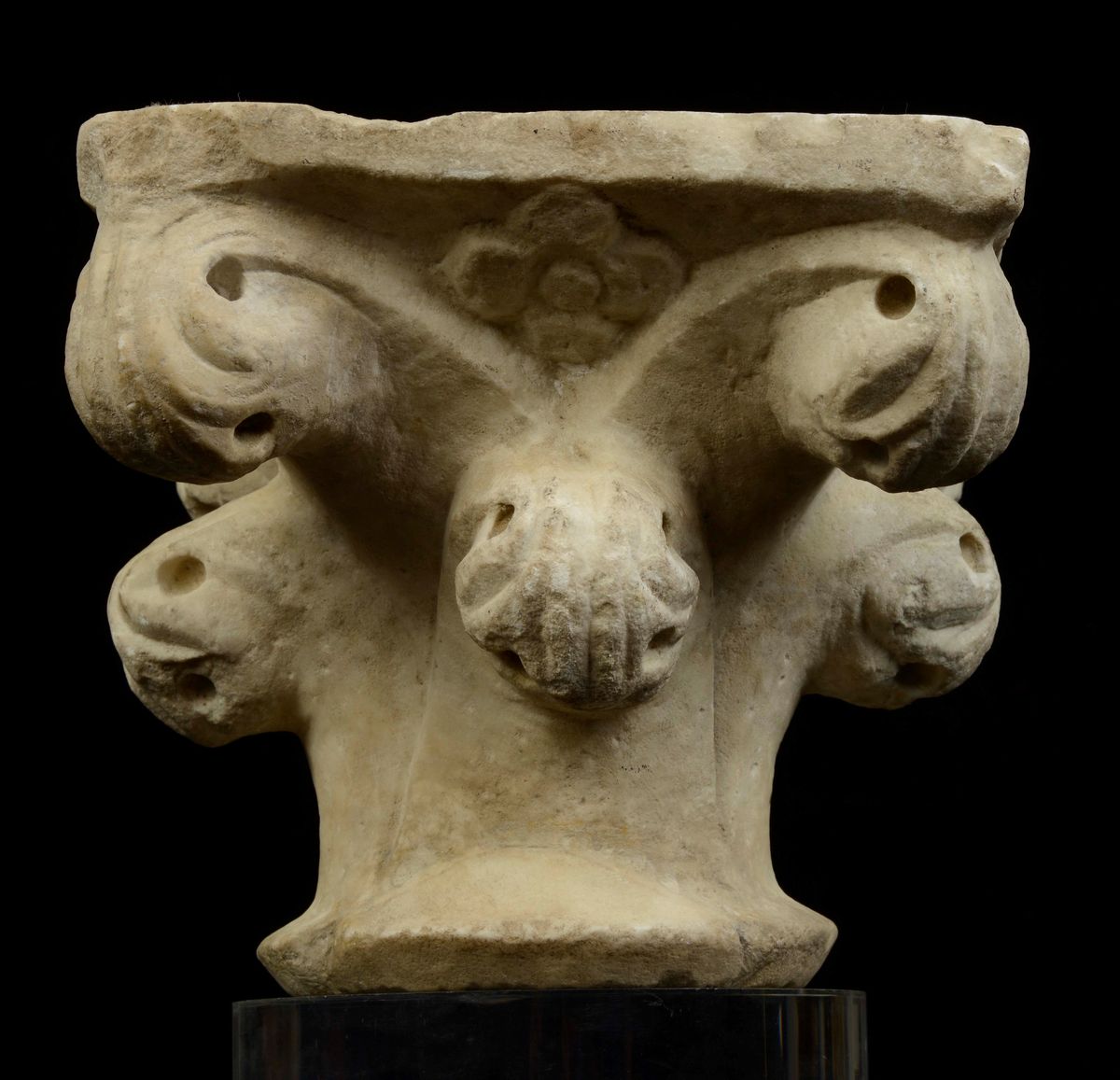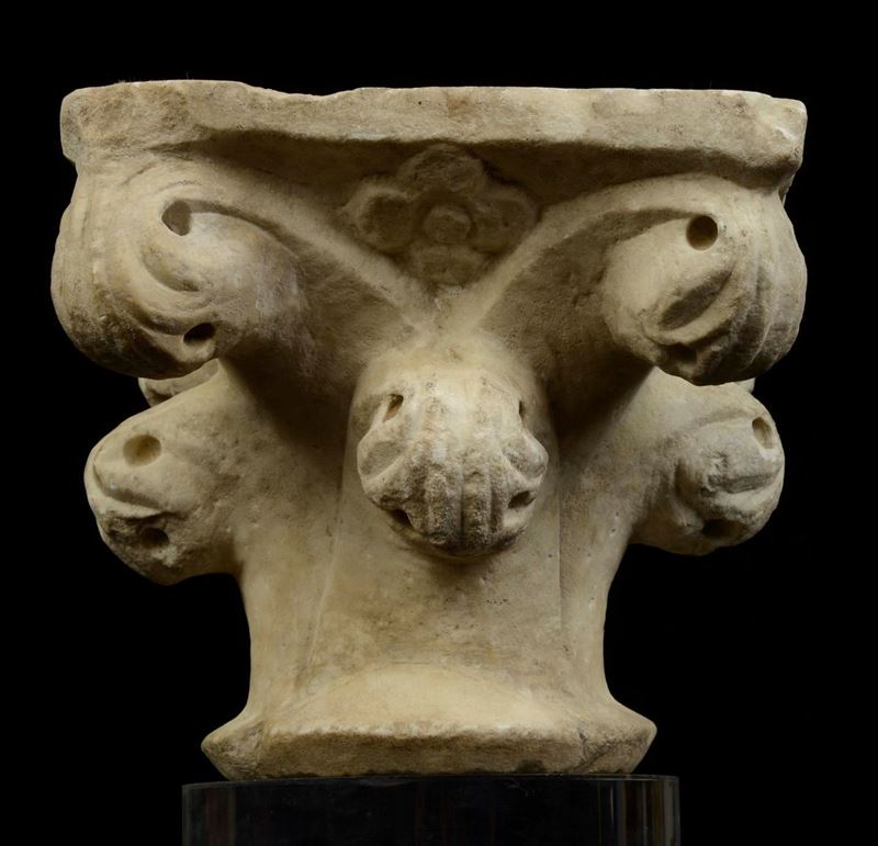 Piccolo capitello in marmo bianco con decoro vegetale a crochet sporgenti, arte gotica italiana del XIV secolo