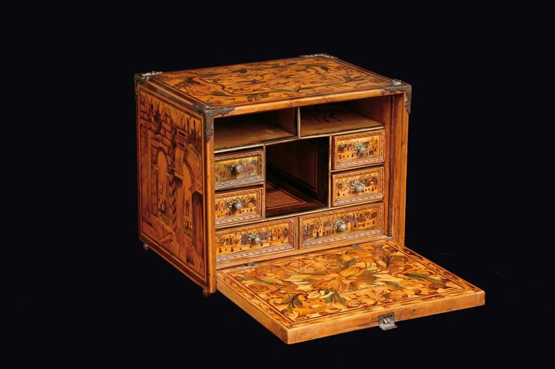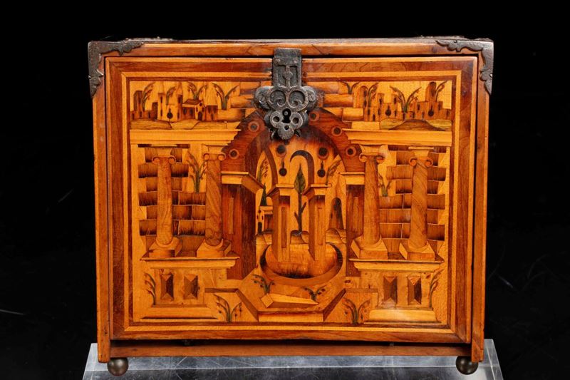 decori a motivo architettonico, a volute e floreali, cm 20x16x18 (mancanze).Il piccolo monetiere appartiene alla ricca e documentata produzione iniziata nel XVI secolo nella Germania del Sud, e che ebbe come centro principale la città di Ausburg, di mobili intarsiati magistralmente con raffigurazioni architettoniche e di genere in varie essenze lignee come l’esotico sicomoro o legni di frutto quali pero, ciliegio, noce, ottenendo così effetti cromatici e prospettici dal raffinato virtuosismo.