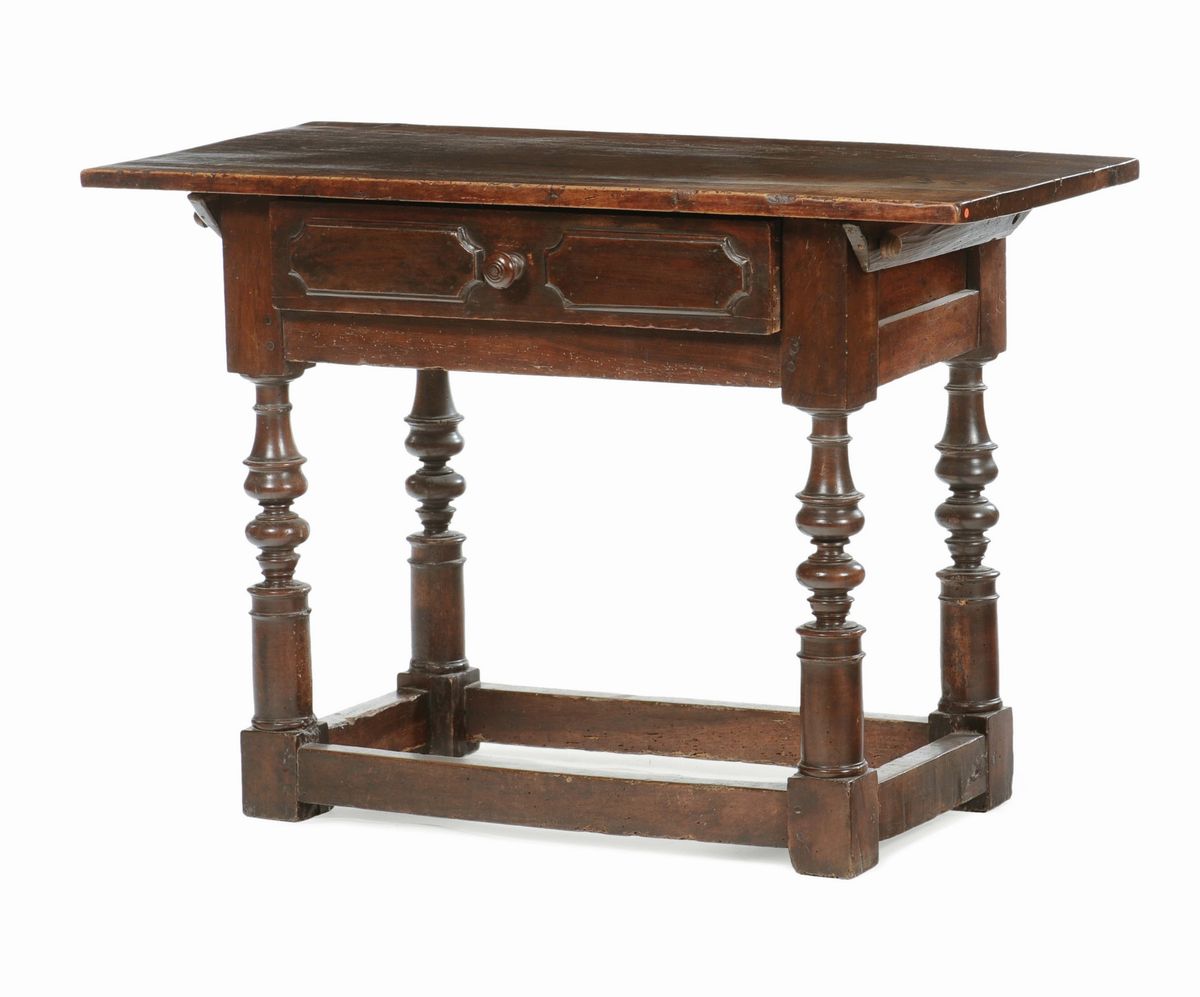 Il mobile, smontabile in vari elementi, è interamente costruito senza l'uso di serrature metalliche. Il piano è unito alla parte sottostante da spinotti lignei a bugnature sagomate, sul fronte lungo cassetto pannellato.Sostegni torniti a rocchetto uniti da traverse diritte, cm 113x55x78,5 (usure)