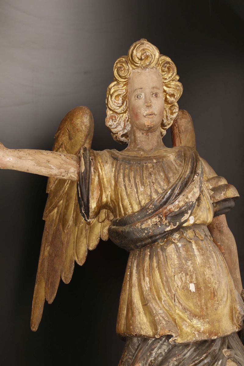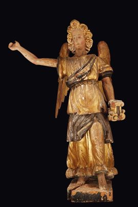 Scultura in legno policromo e dorato raffigurante Angelo reggicero, Scultore tardo manierista attivo in Italia centrale [..]