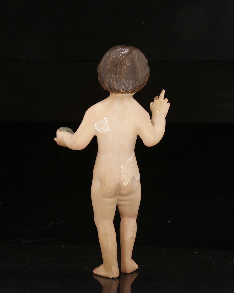 altezza cm 30 (policromia di epoca posteriore).Il piccolo Gesù, qui raffigurato come Salvator Mundi nell’atto benedicente mentre regge con la mano il globo, è opera esemplare della produzione fiamminga cinquecentesca di sculture lignee.