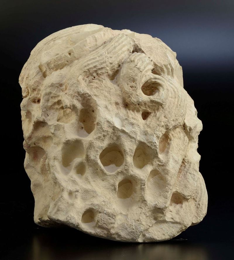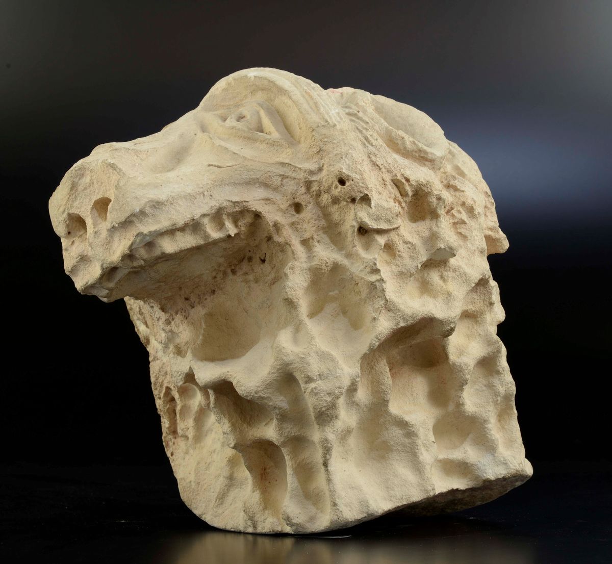 Testa di leone scolpita in pietra calcarea bianca, XIII-XIV secolo