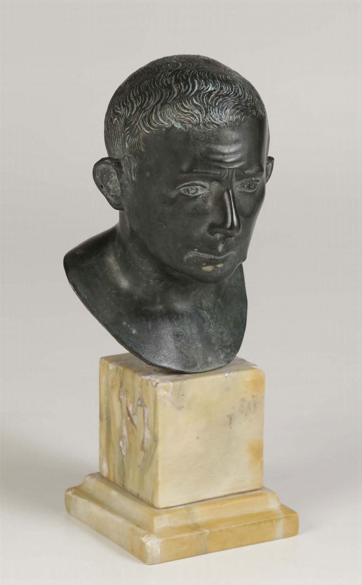 Testa virile in bronzo di gusto archeologico fuso e patinato, Italia XIX-XX secolo