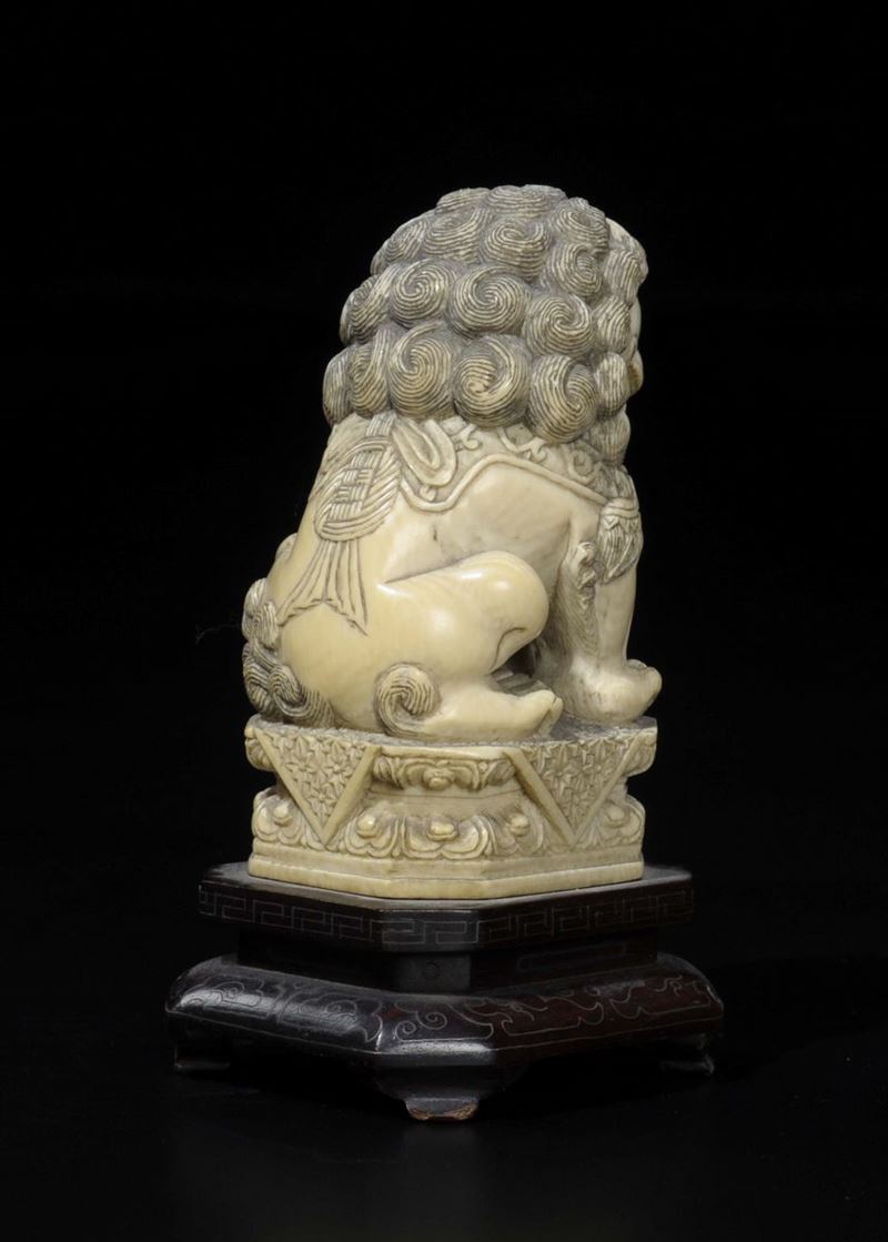 Cane di Pho in avorio seduto su doppio fiore di loto nell'atto di sovrastare un cane più piccolo, Cina, inizio XX secolo