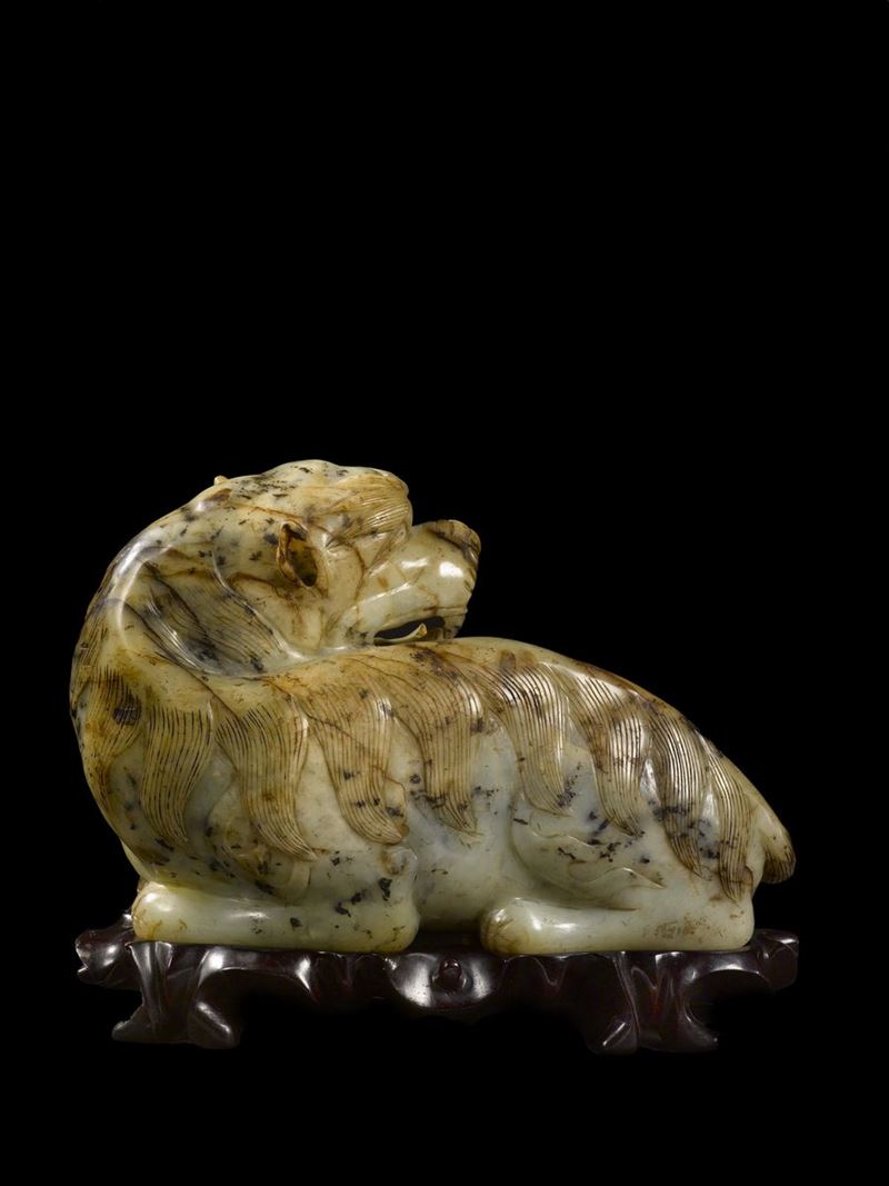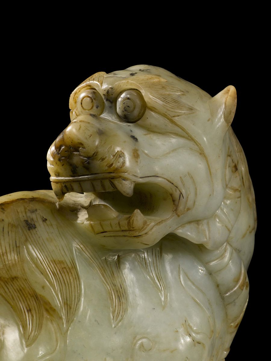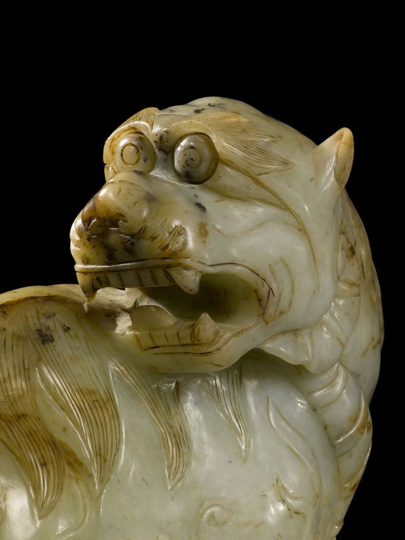 Cane di Pho scolpito in giada bianca e russet, Cina, Dinastia Qing, XIX secolo