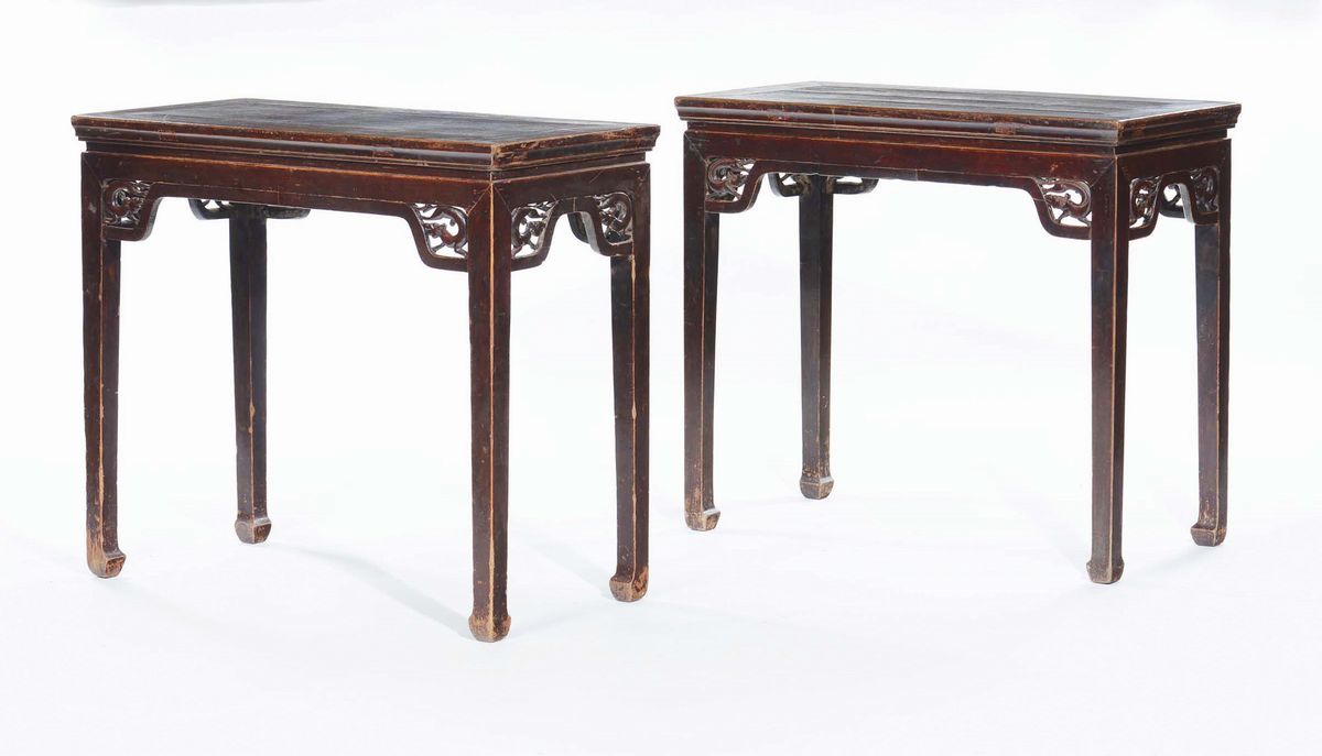 Coppia di console in legno lavorato e traforato, Cina, Dinastia Qing, XIX secolo