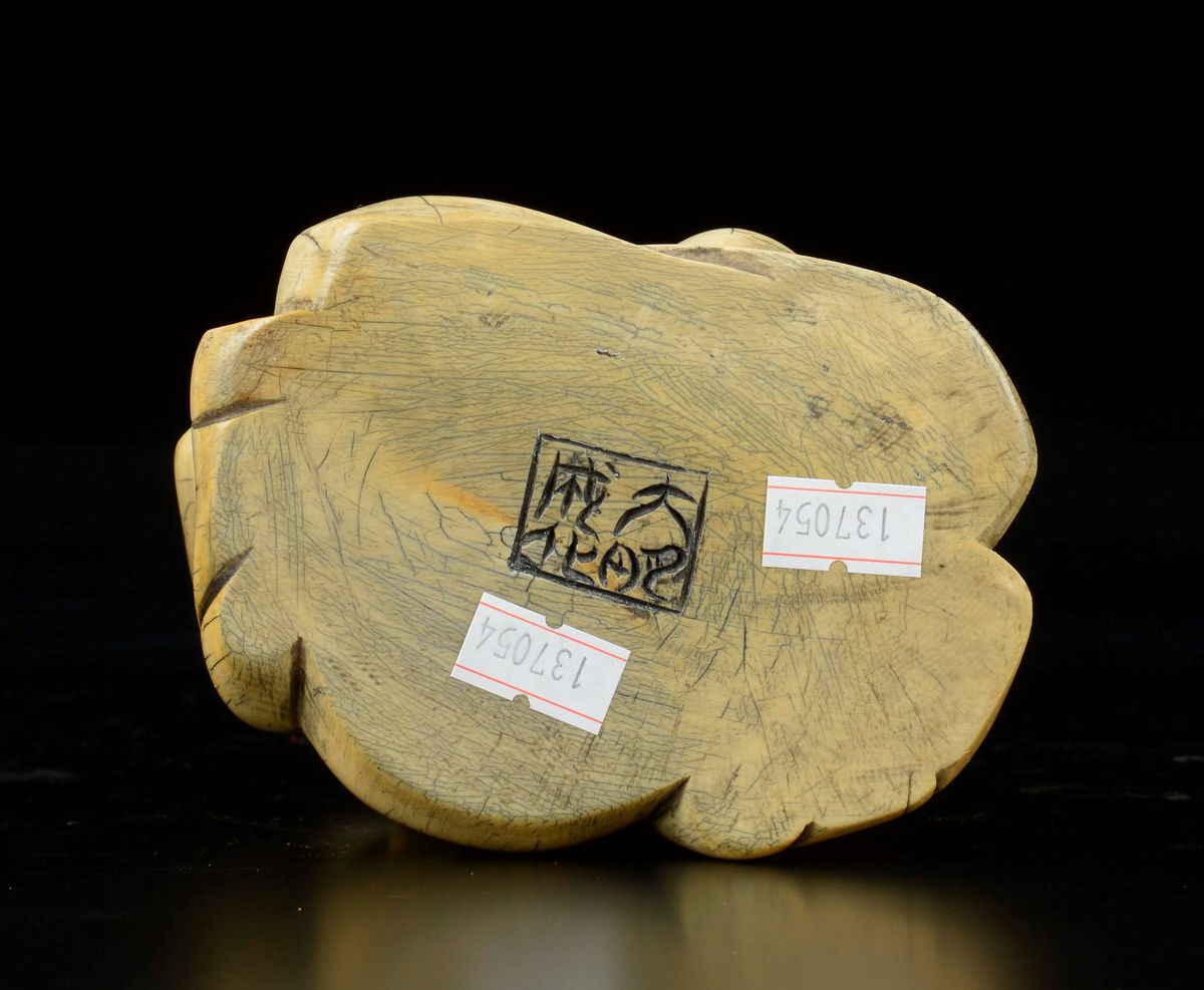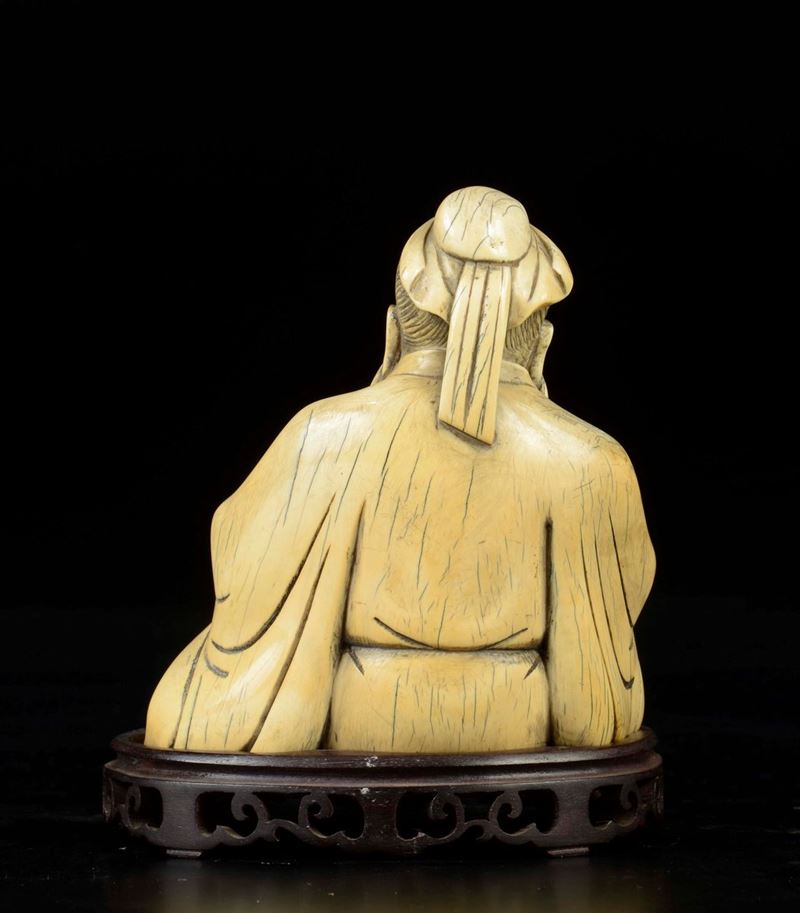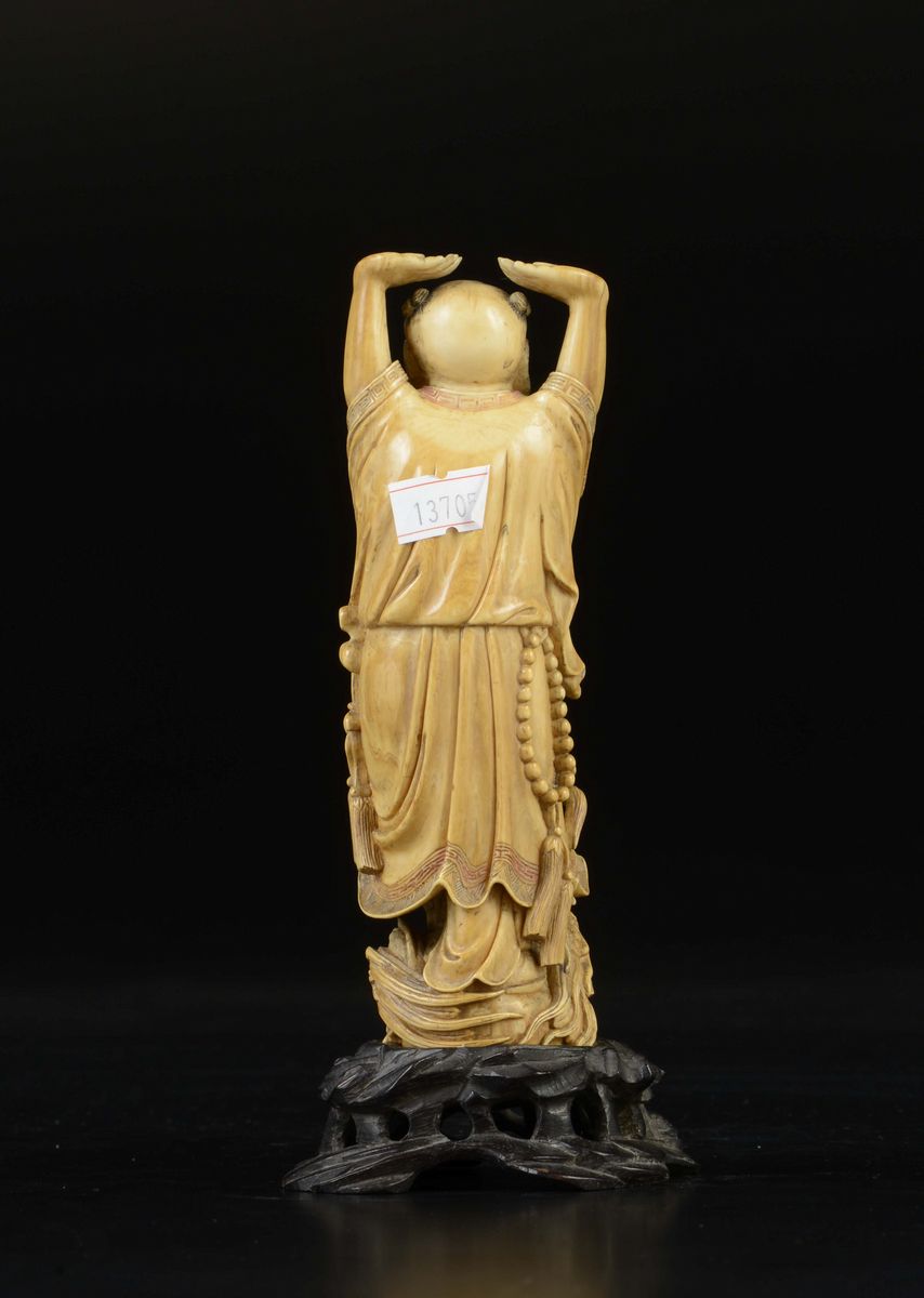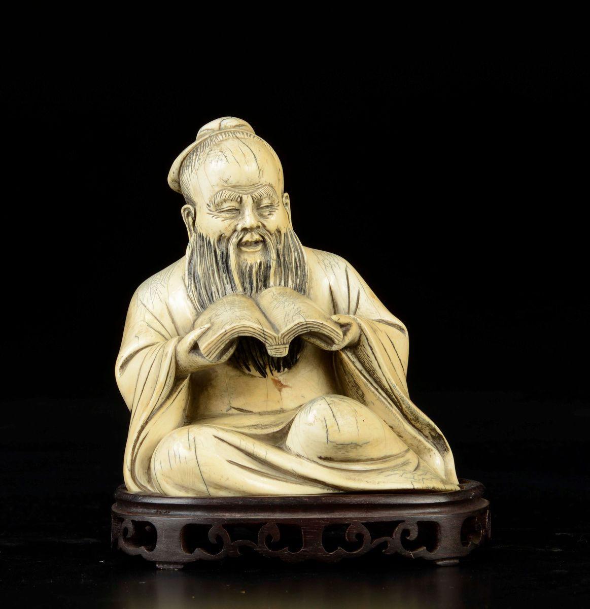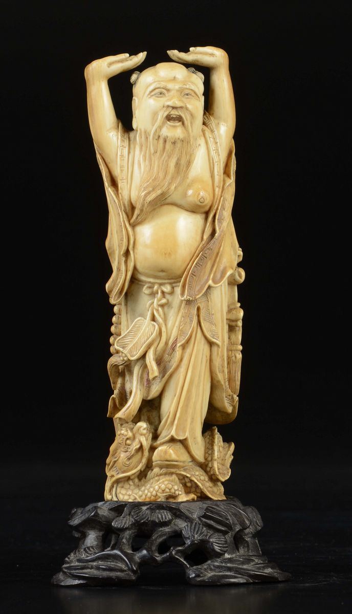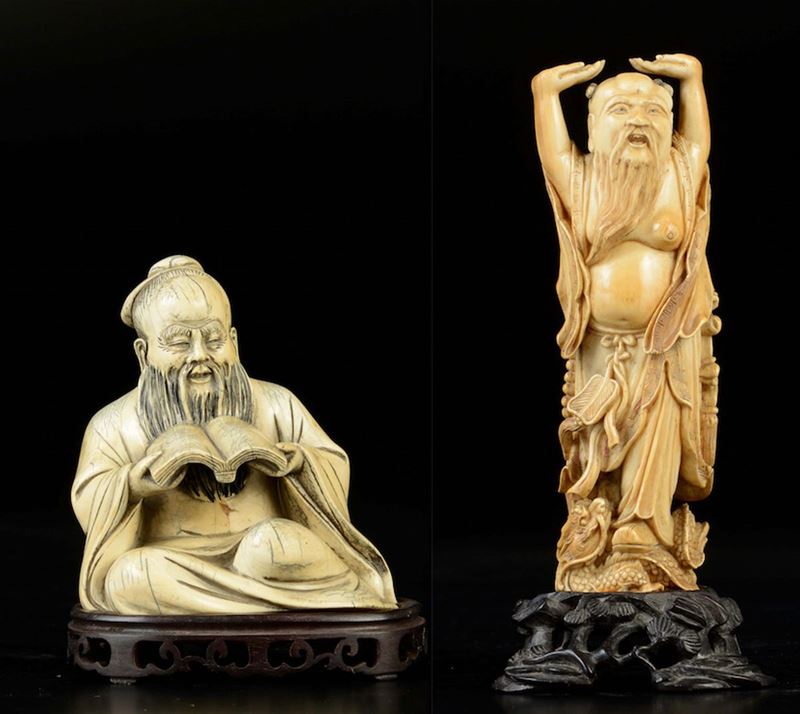 Due figure di saggi scolpite in avorio, uno con le braccia al cielo e uno seduto con libro, Cina, inizio XX secolo